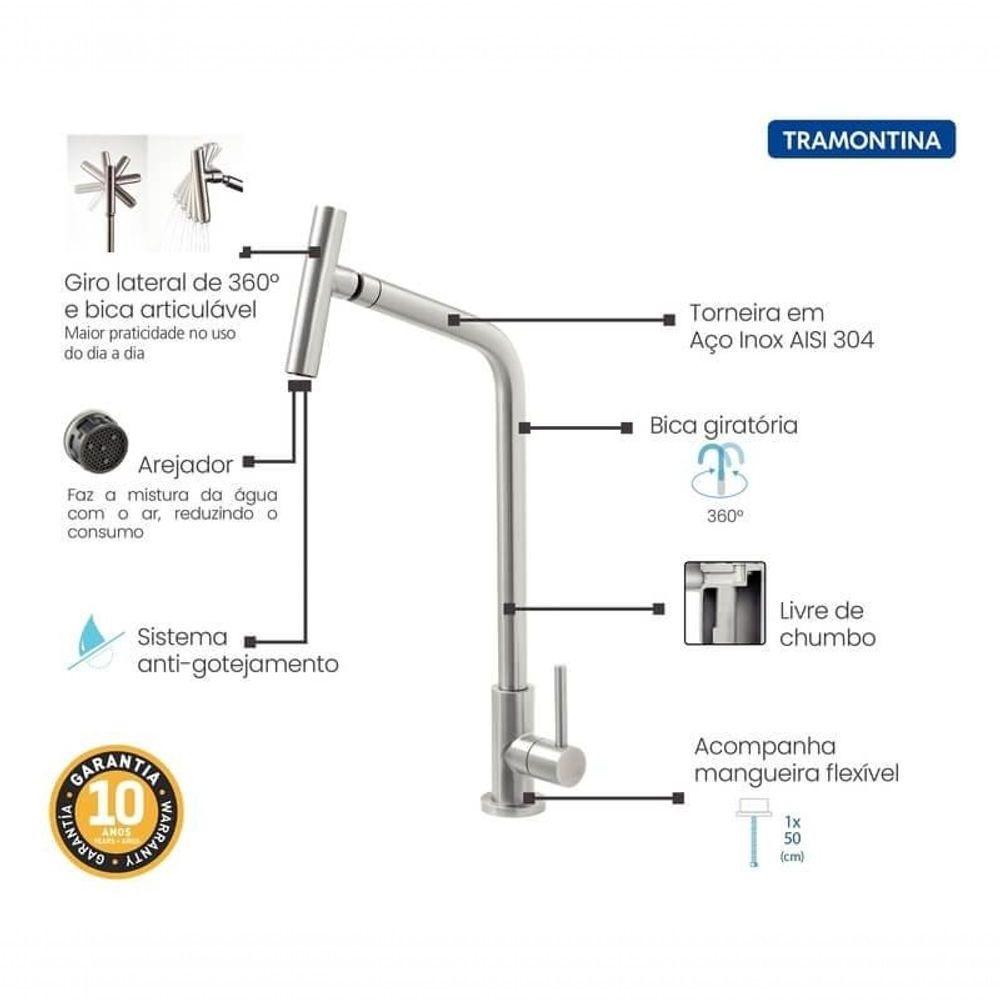 Torneira Versa Tramontina Em Aço Inox Com Bica ArticuladaA Torneira Tramontina Versa em Aço Inox com Bica Articulada, possui características que facilitam as atividades na cozinha. Possui rotação de 360°, que aumenta as possibilidades de uso. Além de sistema anti-gotejamento e arejador que reduz o consumo de água. Com a bica articulável, você tem mais controle do direcionamento do jato d?água. Produzido com material nobre que não possui chumbo em sua composição, o aço inox AISI 304 garante maior higiene, durabilidade e resistência. Além disso, o mecanismo de vedação com discos cerâmicos também assegura maior vida útil ao produto.Recomendações de Uso:Para a limpeza da torneira utilize um pano de algodão macio e preferencialmente seco. Nunca utilize palha de aço, produtos abrasivos, químicos ou solventes para limpeza.Recomenda-se após cada uso manter a peça seca, evitando assim que a água acumulada seque sobre a peça.Informações Adicionais:- Arejador: Sim;- Extensor: Não;- 5m ;- 40m ;- Instalação: Bancada;- Bica articulável: Sim;- Monocomando: Não;- Acabamento: Scotch Brite;- Material: Aço Inox AISI 304;- Sistema anti-gotejamento: Sim;- Corpo giratório: Sim, 360 graus;- Água quente e fria: Não, só órios inclusos:- 01 Mangueira ível 50 meramente ilustrativa.