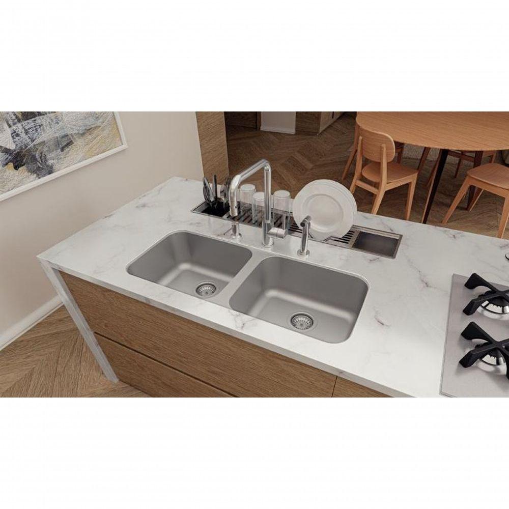 Cuba Tramontina Dora Duo 2c 40 Bl Em Aço Inox Com Acabamento EscovadoA cuba Tramontina Dora Duo 2C 40 BL em aço inox com acabamento acetinado é a escolha ideal para a sua cozinha. Com duas cubas espaçosas e um design elegante em aço inoxidável acetinado, ela transforma sua experiência na cozinha. Suas dimensões de 890x390x185 milímetros e capacidade de 23 litros em cada bacia garantem espaço suficiente para lavar louças grandes e pequenas. O acabamento acetinado confere um toque de sofisticação ao ambiente. A instalação por baixo facilita o encaixe perfeito da cuba na bancada, proporcionando praticidade e durabilidade. A cuba Tramontina Dora Duo 2C 40 BL em aço inox é a solução perfeita para quem busca qualidade e estilo na cozinha!Recomendações de Uso:Modo de Uso: Para um perfeito funcionamento da cuba, montar inicialmente a válvula. Remover a etiqueta colada na pia. Limpar a cuba com detergentes normais neutros. Usar somente esponja macia ou pano para lavar a pia. Esta peça contém bordas cortantes. Manusear com cuidado. Não usar ácido muriático, água sanitária ou qualquer outro solvente para lavar objetos na pia. Na reforma ou construção, proteger a cuba para não deixar sobre a mesma pó de cimento ou gesso. Enxaguar e secar bem a peça após o uso. Nunca deixar objetos metálicos sobre a peça por períodos muito longos, para evitar a corrosão. Para manter o brilho da sua cuba, recomendamos o uso da pasta para polir e remover manchas em superfícies de aço inoxidável "Tramontina".- Foto meramente ilustrativa.Informações Adicionais:- Aço Inox AISI 304;- Acompanha:02 válvulas de ø 4 ½";- Manta adesiva anti-ruído: sim.