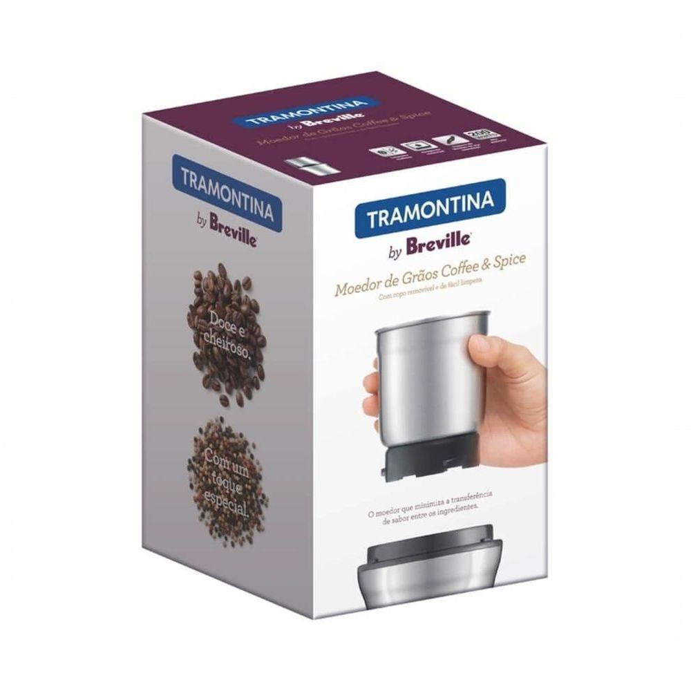 Moedor De Grãos Tramontina By Breville Coffee & Spice 127 VDesign diferenciado, acabamentos impecáveis, funcionalidades inteligentes é nessa combinação de qualidades que está na essência da linha Tramontina by Breville. São eletroportáteis que renovam a cozinha e fazem despertar a paixão pela comida. A perfeição inspira a fazer bonito. O Moedor de Grãos Coffee and Spice Tramontina by Breville 127V possui design sofisticado, produzido em aço inox fosco e 200W de potência. Facilite e surpreenda-se!Recomendações de Uso:Antes de usar, leia cuidadosamente todas as instruções do manual e guarde-o para consultas futuras. Antes de usar o Moedor pela primeira vez, remova e descarte com todos os materiais da embalagem e etiquetas promocionais. Não coloque o Moedor da Tramontina perto das bordas do balcão ou da mesa durante a sua utilização. Assegure-se de que a superfície esteja nivelada, limpa e seca. Para evitar choques elétricos, não mergulhe a base do moedor, o cabo e o plugue de alimentação em água, nem permita que essas peças entrem em com umidade. Não use o aparelho continuamente por mais de 60 segundos, pois isso pode causar superaquecimento. Deixe-o esfriar por 10-15 minutos após funcionar por períodos longos. Não encha demais o recipiente. Cuidado ao limpar o recipiente de trituração, pois as lâminas são afiadas. Não use o aparelho para nenhuma outra finalidade além de moer grãos. O aparelho não mói alimentos úmidos ou extremamente duros, nem produz pastas de frutas, sementes ou ervas, como curry ou creme de amendoim. Este aparelho não deve ser por crianças. Mantenha o aparelho e o cabo fora do seu alcance.Informações Adicionais:-Tensão: 127V;-Frequência: 60 Hz;-Potência: 200W;-Sistema de lâminas de aço inoxidável;-Recipiente interno de aço inoxidável;-Tampa transparente;-LIGA/DESLIGA: ativação por toque.