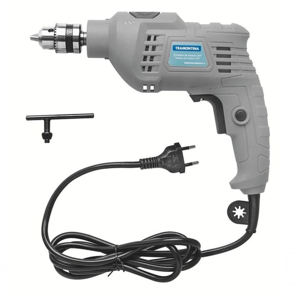 Furadeira De Impacto Tramontina 500 W Com Sistema De E Travamento De Gatilho 127 VAinda que pequenas manutenções pareçam simples, ter o equipamento certo faz toda a diferença. A Furadeira de Impacto Tramontina 500 W foi pensada para quem gosta de resolver tudo por conta própria e valoriza eficiência com . Com potência ideal para perfurar madeira, metal ou alvenaria, ela garante desempenho consistente nas mais diversas aplicações. Leve, prática e fácil de manusear, essa furadeira é daquelas que não podem faltar no seu kit. Seja para fixar prateleiras, montar móveis ou realizar reparos no dia a dia, ela é a parceira certa para você colocar a mão na massa com confiança.Recomendações de Uso:Modo de uso: leia atentamente e guarde para futura referência o manual de instrução. Confira a tensão indicada no produto antes de usá-lo. Use óculos, luvas e outros equipamentos de proteção individual (EPIs) de acordo com a tarefa a ser executada. Não trabalhe com ferramentas elétricas em ambientes com risco de explosão ou onde se encontram líquidos, gases e pó inflamáveis. Não utilize o cabo da ferramenta para transportar, pendurar ou desconectar o plugue da tomada. Sempre desconecte o plugue elétrico da rede antes de fazer uma inspeção ou limpeza da ferramenta. Sempre verifique se a estrutura, o cordão elétrico ou o plugue não estão danificados ou com possíveis trincas que podem levar a um choque elétrico. Nunca utilize água ou componentes químicos para limpar o equipamento. Use um pano seco para esse trabalho. As entradas e as saídas de ar devem ser limpas regularmente para evitar o bloqueio da passagem de ar para a ventilação do motor. Caso esse procedimento não seja tomado, o motor pode superaquecer causando danos à ferramenta. Mantenha o ambiente de trabalho sempre limpo e arejado para evitar a entrada de poeira e partículas de materiais no sistema de ventilação da ferramenta. Armazene em limpo e seco.- Mantenha fora do alcance das crianças.- Foto meramente ilustrativa.Informações Adicionais:- Potência: 500 W;- Impactos: 48000 ipm;- Frequência: 50/60 Hz;- Mandril de 3/8'' - 10 mm;- Rotação: 3000 min-1 / rpm;- Sistema interno 100% rolamentado;- Botão lateral para o travamento do gatilho;- Excelente desempenho em operações de perfuração;- Seletor de operação: furação normal / furação com impacto;- Cabo elétrico de 1,8 m com plugue certificado pelo INMETRO;- Acompanha chave para aperto do mandril e manual de instruções;- Ideal para trabalhos domésticos em concreto, alvenaria, aço e madeira;- Trava lateral para quando a ferramenta for utilizada em trabalhos contínuos;- Botão com de velocidade, propiciando um maior conforto e praticidade durante a operação.