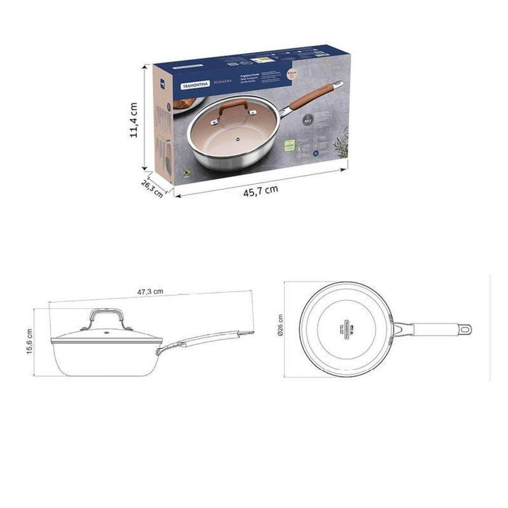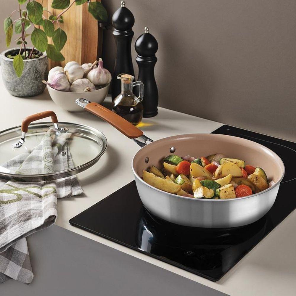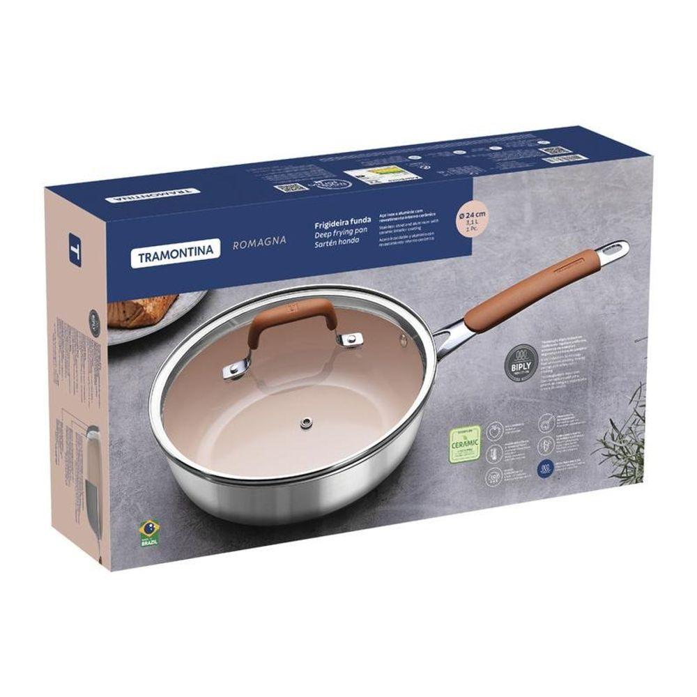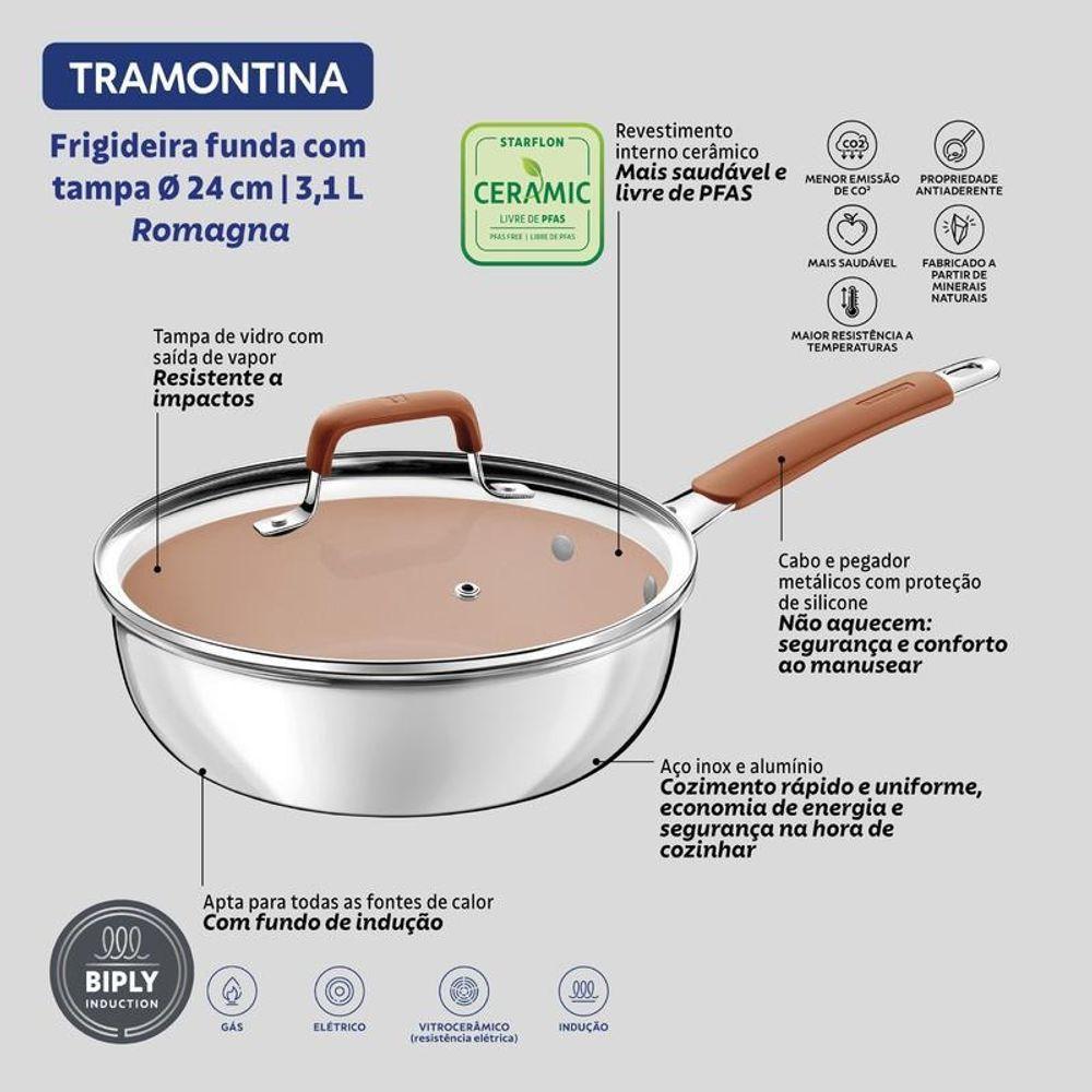 Frigideira Tramontina Funda Com Tampa Romagna Aço Inox E Alumínio Com Revestimento Cerâmico Marfim 24cmQuando a receita pede espaço, controle e resultado impecável, a Tramontina Romagna responde com performance e beleza em cada detalhe.Com 24cm de diâmetro e capacidade de 3,1 litros, essa frigideira funda com tampa é perfeita para preparar porções generosas, seja para um almoço em família ou um jantar especial. A tecnologia Biply Induction, combinação de aço inox e alumínio, garante aquecimento uniforme e rápido, com todos os tipos de fogão, inclusive por indução. Já o revestimento cerâmico interno na cor marfim evita que os alimentos grudem e torna a limpeza muito mais simples, mesmo após o preparo de pratos mais elaborados. A tampa de vidro temperado permite acompanhar o cozimento sem abrir mão da temperatura e da umidade, enquanto o cabo com proteção em silicone proporciona e conforto durante o uso. Com visual sofisticado e acabamento que valoriza qualquer ambiente, essa frigideira da linha Romagna é muito mais do que um utensílio: é um convite para cozinhar com confiança, liberdade e um toque de personalidade. Ideal para quem busca uma frigideira cerâmica grande, resistente e moderna. Com a Tramontina, preparar refeições se transforma em um momento mais leve e prazeroso, do fogão à mesa.Recomendações de Uso:Modo de uso: O uso prolongado em temperaturas altas pode causar o amarelamento da superfície em aço inox. Para que a panela de aço inox fique sempre bonita e com brilho, recomendamos que seja lavada somente com detergente neutro e esponja. Nas partes foscas da panela pode-se utilizar o lado mais abrasivo da esponja com saponáceo líquido, para remover as manchas mais difíceis, ou ainda, pode ser usada a pasta para polimento e remoção de manchas da Tramontina. Depois da lavagem, enxágue a panela com água quente e seque-a imediatamente, para que ela mantenha o brilho , pois o cloro e as substâncias contidas na água podem deixar manchas na panela.- Foto meramente ilustrativa.Informações Adicionais:- Corpo de aço inox + alumínio;- Com espessura de 2,7 mm de alumínio e 0,6 mm de aço inox;- Tecnologia Biply: Dupla camada: durabilidade do aço inox + eficiência do alumínio;- Seu utensílio resiste à máquina de lavar louças, embora diferentes detergentes para uso nestas máquinas podem ser mais agressivos e acelerar o desgaste de seu utensílio e reduzir as propriedades de antiaderência.