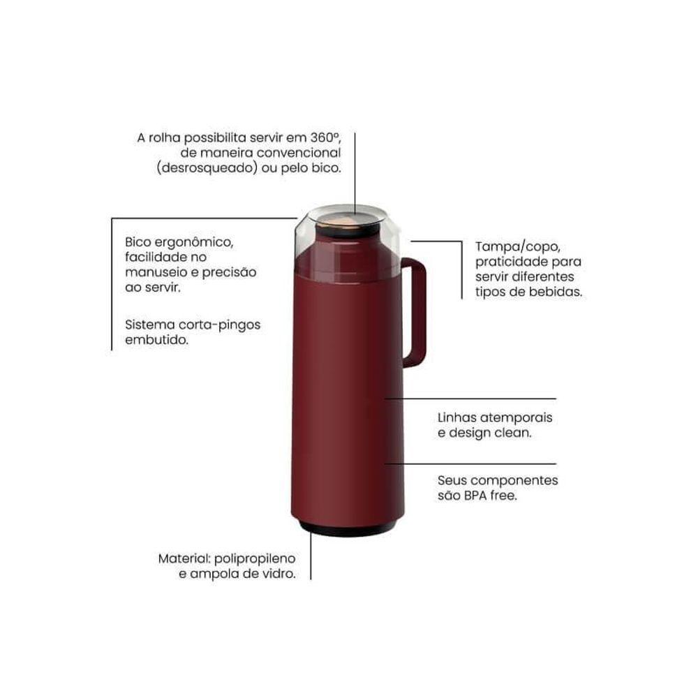 Garrafa Térmica Tramontina Exata Vermelha Com Ampola De Vidro 1 LitroGaranta praticidade e funcionalidade para o seu dia a dia, com a garrafa térmica Tramontina Exata em polipropileno vermelho com ampola de vidro 1 litro. Perfeita para armazenar suas bebidas preferidas, sejam elas quente ou frias, ela conta com ampola de vidro e corpo em polipropileno com design moderno que garante leveza e segurança. Ela é fácil de manusear e possui bico ergonômico e tampa com estilo copo, que permite a degustação da bebida através dela. Você pode servir em 360 graus ou de maneira tradicional, pelo bico. Além de todas essas características, a garrafa térmica é de fácil de limpeza e proporciona maior facilidade para sua rotina!Recomendações de Uso:Descarte todos os materiais de embalagem e lave o produto;Certifique-se de que o produto esteja bem fechado; não coloque o produto em forno elétrico, micro-ondas, freezer, geladeira e máquina de lavar louças;A capacidade volumétrica poderá ter uma variação de até 10% de seu volume nominal indicado.DICAS:Recomendamos pré-aquecer/pré-refrigerar o produto antes de usar, para manter por mais tempo aquecida/fria a bebida;Para evitar vazamentos, não encha até o topo do produto.CUIDADOS ESPECIAIS:Ao utilizar o produto com água fervente, tenha cuidado ao levantar o bico, pois poderá ocorrer alivio de pressão e assim sair um jato de água quente pelo mesmo.Não agite o produto;Não olhe diretamente para dentro;Não beba diretamente no produto;Não coloque gelo seco, refrigerante, bebidas gaseificadas ou líquidos que possam gerar alta pressão;Não deixe o produto bater ou cair; não coloque bebida quente e em seguida a bebida gelada ou vice-versa, pois isso pode danificar a ampola;Por ser um produto de mesa, recomenda-se que o transporte deste produto seja sempre feito na posição vertical;Mantenha fora do alcance das crianças;Após o uso ou limpeza, aconselhamos deixar o produto aberto;Não remova a ampola de vidro do produto, somente se ela quebrar ou sofrer algum dano e necessitar ser substituída;Todo manuseio de vidro deve ser feito com total atenção, e este produto com ampola de vidro não foge a essa regra;Verifique frequentemente o aperto das peças rosqueáveis (rolha e fundo/base).ORIENTAÇÕES DE LIMPEZA:Lave somente com detergente neutro e esponja macia;Não utilize escova com pontas que possam quebrar a ampola de vidro;Se houver odores desagradáveis, pode-se usar uma solução com a medida de 2 colheres (sopa) de bicarbonato de sódio dissolvidas em água quente (até sua capacidade máxima) e deixar agir por 12 horas; após, fazer a limpeza diária.Informações Adicionais:Com linhas atemporais e design clean, a garrafa térmica da linha Exata combina com qualquer estilo e ambiente.Ideal para manter líquidos quentes ou frios na temperatura adequada por muito mais tempo.Simples e moderna, ocupa menos espaço na sua casa e durante o transporte.Praticidade no uso e segurança para toda a família.Leve e fácil de manusear.Higiênica e de fácil limpeza.Seus componentes são BPA free.Sistema corta-pingos embutido.Bico ergonômico, facilidade no manuseio e precisão ao servir.Tampa/copo, praticidade para servir diferentes tipos de bebidas.A rolha possibilita servir em 360º, de maneira convencional (desrosqueado) ou pelo bico.Material: polipropileno e ampola de vidro.
