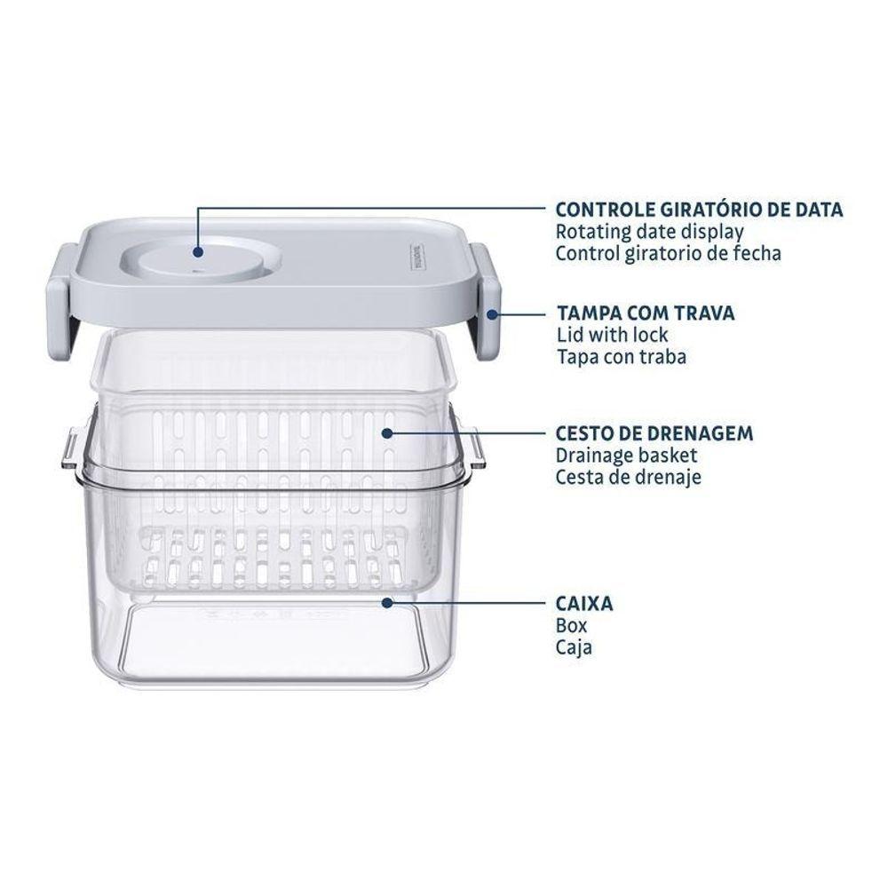 Pote Tramontina Organizador De Geladeira Organizzare 0,9 Litros Com Controle De Umidade O pote organizador de geladeira Tramontina Organizzare com controle de umidade, capacidade de 0,9 L, é perfeito para quem busca manter frutas, vegetais, carnes e laticínios sempre frescos e bem organizados. Produzido em poliestireno resistente, conta com tampa com ventilação ajustável, que regula a umidade interna de acordo com o tipo de alimento. A bandeja de drenagem evita o contato direto com a umidade, preservando textura e qualidade, enquanto o divisor removível permite uma separação prática dos itens. O controle de data giratório facilita o acompanhamento do tempo de armazenamento. Mais frescor, organização e controle para o seu dia a dia.Recomendações de Uso:Modo de Uso: ;Confira o produto para garantir que ele não tenha sido danificado durante o transporte. Lave o produto com água e detergente neutro antes de usar. Use apenas sabão ou detergente e uma esponja macia. Outros tipos de produto, como palha de aço, poderão riscar ou prejudicar o brilho das peças. Evite batidas que possam ocasionar trincas ou quebras no produto. Não jogar água fervente diretamente sobre o organizador.- Foto meramente ilustrativa.Informações Adicionais:- Design de fluxo de ar aprimorado;- A função giratória do mostrador de data torna fácil definir o período de armazenamento;- Usando o divisor removível, o cesto de drenagem pode alternar entre dois estados de divisão: esquerda-direita e superior-inferior;- Possui bandeja de drenagem que impede que a umidade acumulada se mantenha no alimento, evitando o murchamento e a deterioração precoce;- Ventilação e umidade controladas: a tampa com ventilação ajustável mantém o nível ideal de umidade para cada tipo de alimento, mantendo-os frescos por mais tempo.