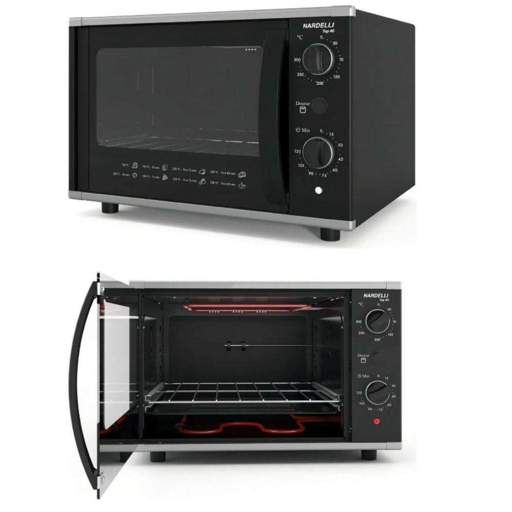 Forno Elétrico Nardelli Top 40 40L Black 220VEspaço pequeno, cozinha idealSe a sua cozinha é pequena, o forno de mesa é a melhor solução. Você desfrutará das mesmas vantagens que um forno convencional e ganhará praticidade e conforto.Mantenha o saborCom sua função grill, você pode fazer sua comida mais dourada, crocante e saborosa. É ideal para cozinhar e aquecer pizzas, empanadas e bolos.Que não passeO temporizador programável o ajudará a ajustar o tempo preciso em cada receita. Além disso, com o termostato ajustável, você será capaz de lidar com o calor certo e obter o ponto certo.Aviso legal- Eficiência energética A.