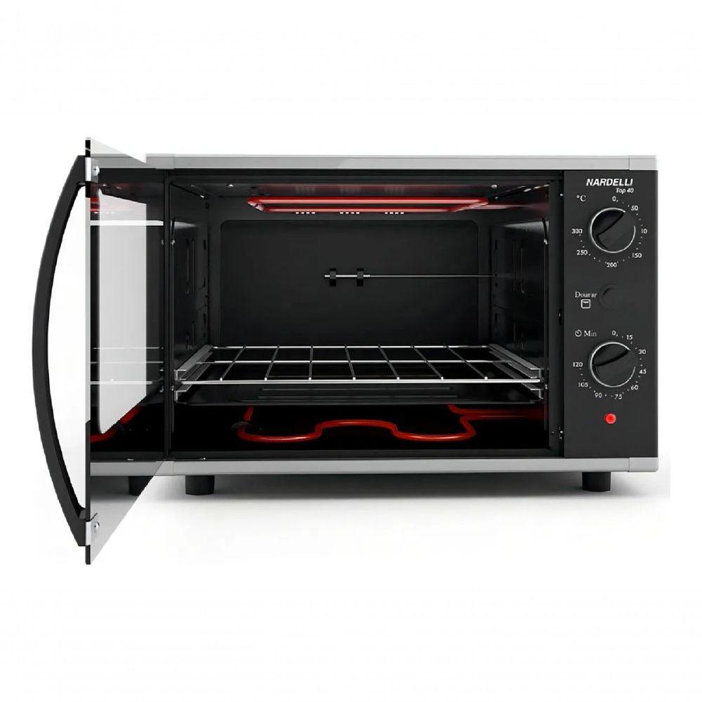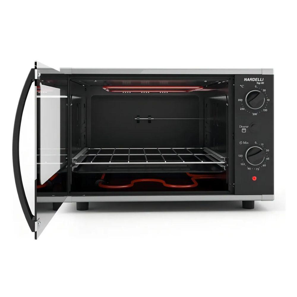 Forno Elétrico Nardelli Top 40 40L Black 110VDescriçãoEspaço pequeno, cozinha idealSe a sua cozinha é pequena, o forno de mesa é a melhor solução. Você desfrutará das mesmas vantagens que um forno convencional e ganhará praticidade e conforto.Mantenha o saborCom sua função grill, você pode fazer sua comida mais dourada, crocante e saborosa. É ideal para cozinhar e aquecer pizzas, empanadas e bolos.Que não passeO temporizador programável o ajudará a ajustar o tempo preciso em cada receita. Além disso, com o termostato ajustável, você será capaz de lidar com o calor certo e obter o ponto certo.Aviso legal- Eficiência energética A.