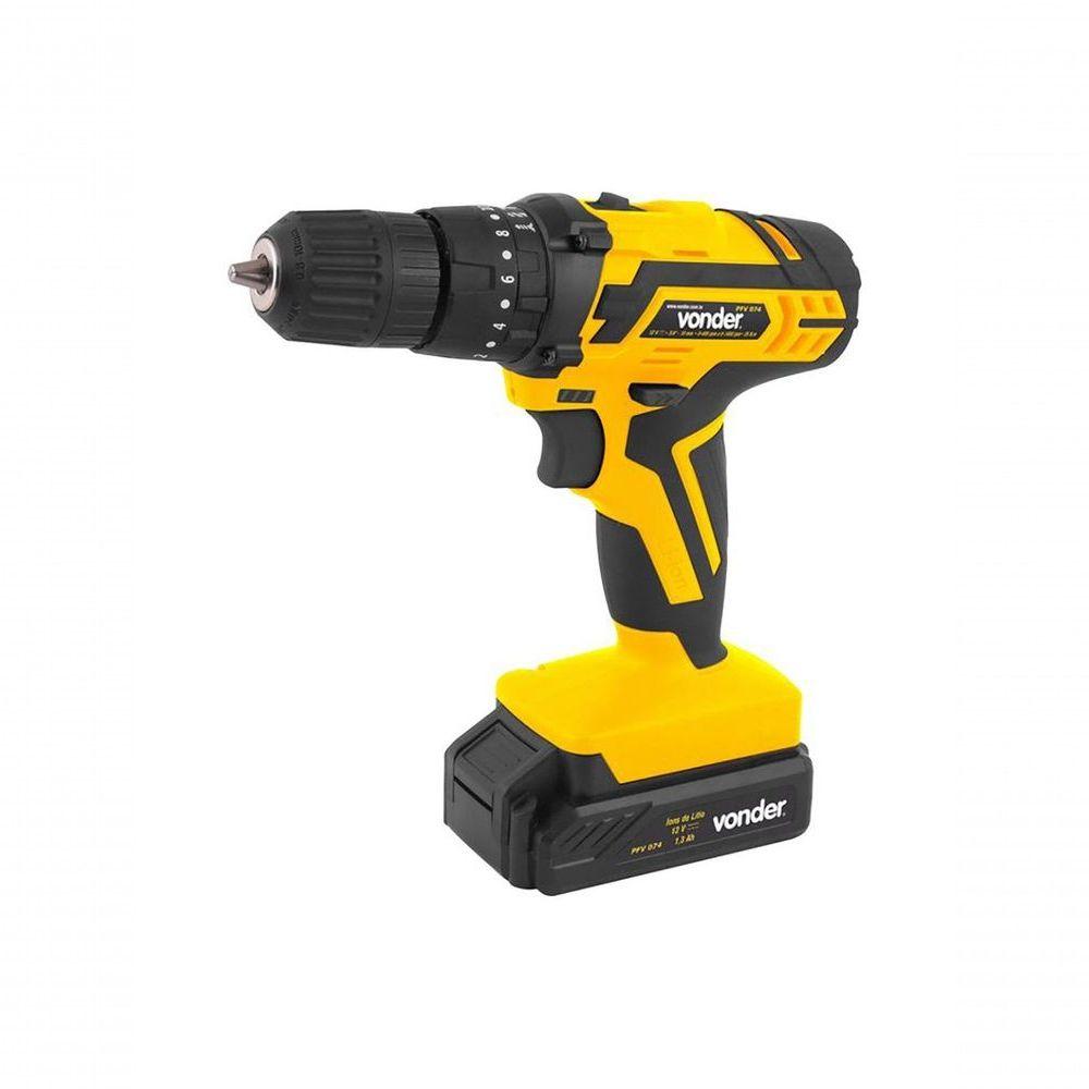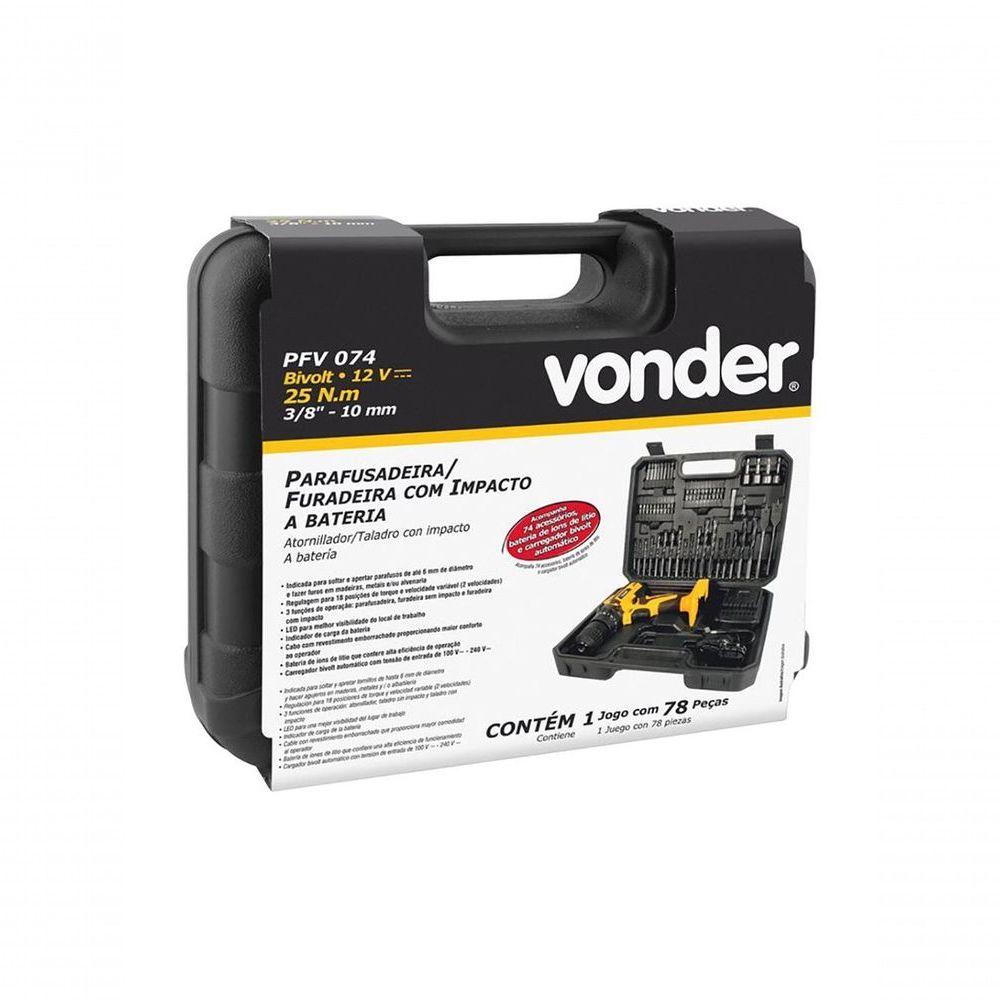 Parafusadeira/ Furadeira Bateria Vonder Pfv074 12v + Kit...Informações do Produto Parafusadeira/Furadeira com Impacto a bateria, 12 V, Carregador Bivolt Automático, Jogo com 74 Peças, PFV 074 - 60.01.074.000 Indicada para soltar e apertar parafusos de até 6 mm de diâmetro e fazer furos em madeiras, metais e/ou alvenaria. Tempo de carregamento da bateria: 3 a 5 horas. Acompanha 74 acessórios encaixados perfeitamente na maleta, conferindo organização, praticidade e maior vida útil dos acessórios. Possui regulagem para 18 posições de torque e velocidade variável (2 velocidades)....Informações do Produto Parafusadeira/Furadeira com Impacto a bateria, 12 V, Carregador Bivolt Automático, Jogo com 74 Peças, PFV 074 - 60.01.074.000 Indicada para soltar e apertar parafusos de até 6 mm de diâmetro e fazer furos em madeiras, metais e/ou alvenaria. Tempo de carregamento da bateria: 3 a 5 horas. Acompanha 74 acessórios encaixados perfeitamente na maleta, conferindo organização, praticidade e maior vida útil dos acessórios. Possui regulagem para 18 posições de torque e velocidade variável (2 velocidades)....