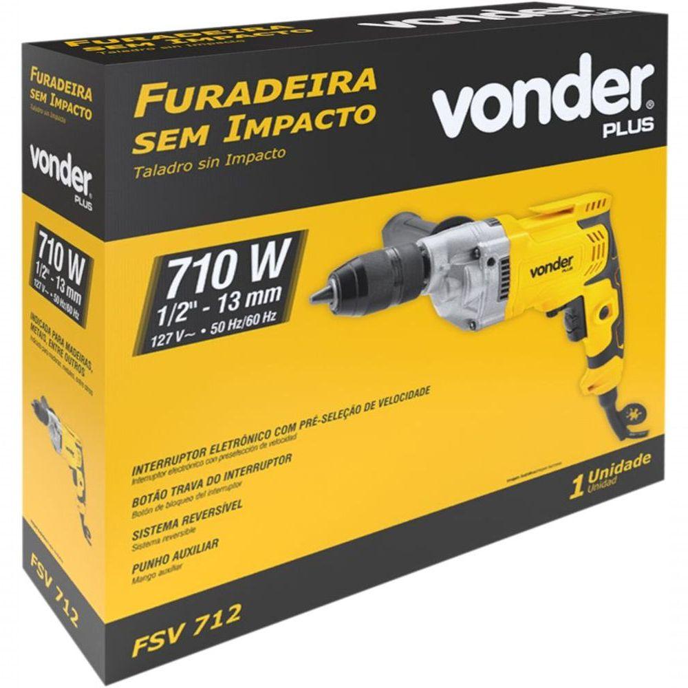 Furadeira 1/2 Fsv712 110V Vonder PlusMarca: VonderConteúdo da embalagem:1 Furadeira sem impacto. Acompanha: 1 punho auxiliar.Destaques e diferenciais:Possui interruptor eletrônico com pré-seleção de velocidade para controle da rotação da máquina, possibilitando iniciar um furo com uma rotação baixa e aumentar gradativamente de acordo com a necessidade de perfuração. Conta também com sistema reversível, que facilita a retirada da broca caso ela trave durante a perfuração. Possui botão trava do interruptor para trabalhos contínuos, punho auxiliar e motor com dupla isolação, que garante maior .Aplicações e dicas de uso:Uso industrial. Indicada para madeiras, metais, entre outros, deve ser utilizada com os acessórios adequados. Não indicada para furar concreto.Detalhes TécnicosModelo: FSV 712 Potência: 710 W Tipo de mandril: Aperto rápido Capacidade do mandril: 1/2 - 13 mm Sistema de : Sim Tipo de velocidade: Variável Rotações por minuto (rpm): 0 - Capacidade máxima de perfuração em aço: 13,0 mm Capacidade máxima de perfuração em madeira: 35,0 mm Tensão (V): 110V~ Frequência (Hz): 50 Hz/60 Hz Incerteza da aceleração transmitida nas mãos - braços do operador - k: 1,5 m/s² Aceleração transmitida nas mãos - braços do operador - ah: 2,326 m/s² Segue norma: ABNT NBR IEC 60745-1 e ABNT NBR IEC 60745-2-1 Massa aproximada (peso) (kg): 2,0 kgGarantia - E (CDC):Garantia legal: 90 dias + Garantia contratual: 9 meses (Para locadoras, garantia única e exclusiva de 90 dias) Voltagem: 110V