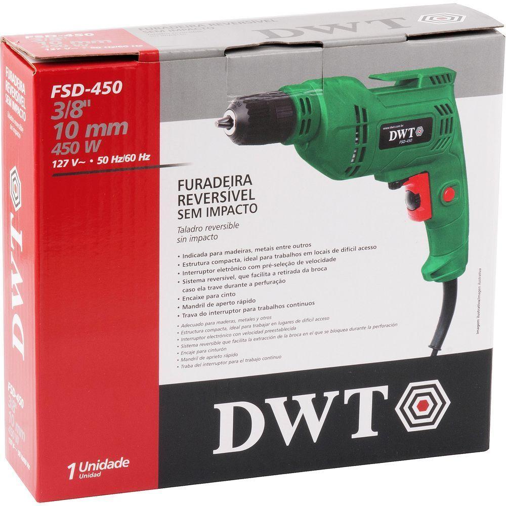 Furadeira Sem Impacto 3/8'' 450 W Fsd 450 Bm450 220V DwtA Furadeira Sem Impacto 3/8'' 450 W FSD 450 BM450 220V da DWT é a ferramenta ideal para quem busca eficiência e praticidade em suas atividades de perfuração. Com um design compacto, ela é perfeita para trabalhos em locais de difícil acesso, garantindo que você possa realizar suas tarefas com precisão e conforto. A furadeira possui um interruptor eletrônico com pré-seleção de velocidade, permitindo que você controle a rotação da máquina de acordo com a necessidade, começando com uma rotação baixa e aumentando gradativamente. Além disso, o sistema reversível facilita a retirada da broca caso ela trave durante a perfuração, e o botão trava do interruptor é ideal para trabalhos contínuos. A DWT é uma marca reconhecida pela qualidade e durabilidade de seus produtos, e esta furadeira não é exceção. Com motor de dupla isolação, ela oferece maior durante o uso. O mandril de aperto rápido proporciona uma troca ágil dos acessórios, e o encaixe para cinto facilita o e a proximidade da ferramenta junto ao operador. Indicada para perfurações em madeira e metal, esta furadeira não é recomendada para concreto, devendo ser utilizada com os acessórios adequados para cada material.ESPECIFICAÇÕES TÉCNICAS:- Marca: DWT- Modelo: - Potência: 450 W- Tensão: 220 V- Capacidade do mandril: 3/8 - 10 mm- Velocidade máxima de rotação: 2800 rpm- Velocidade mínima de rotação: 0 rpm- Capacidade máxima de perfuração em metal: 10 mm- Capacidade máxima de perfuração em madeira: 20 mm- Peso: kg- Dimensões da embalagem: 25 cm x cm x 7 cm- Peso da embalagem: 1500 g- Cor principal: Verde- Tipos de alimentação: Corrente elétrica- Com botão de bloqueio: Sim- Com função reversa: Sim- Com velocidade variável: SimITENS INCLUSOS:- 1 Furadeira sem impacto Produto: Furadeira | Voltagem: 220V | Marca: DWT | É sem fio: Não | Cor principal: Verde