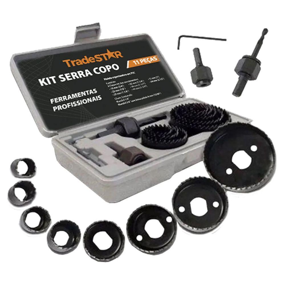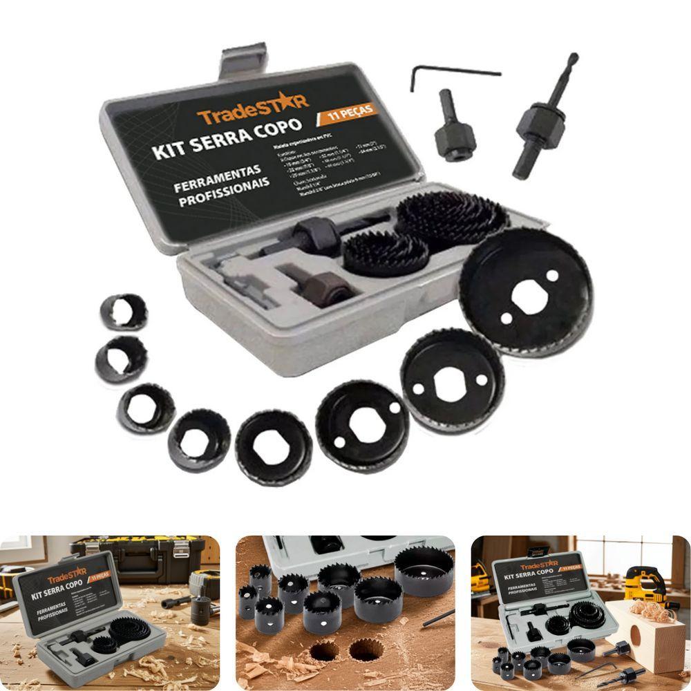 Jogo Serra Copo 19 - 64 Mm Aço Carbono TradestarJogo Serra Copo Tradestar 11 peças 19 até 64 mm Aço CarbonoO Jogo de Serra Copo Tradestar 11 Peças é a solução ideal para quem busca praticidade, precisão e eficiência na execução de cortes circulares. Fabricadas em aço carbono de alta durabilidade, as serras oferecem resistência e longa vida útil, sendo perfeitas para aplicações em madeira, MDF e compensado.Composto por 8 tamanhos diferentes de serras copo, o kit atende às mais necessidades em obras, marcenaria, reformas e projetos DIY. Além disso, acompanha 2 hastes de acoplamento com broca piloto, garantindo cortes firmes e seguros, e uma chave Allen para montagem rápida e prática.Para maior organização e , o conjunto vem acondicionado em uma maleta plástica resistente, que mantém todas as peças bem protegidas e sempre à mão. Uma ferramenta indispensável tanto para profissionais quanto para hobbistas que exigem qualidade e versatilidade no dia a dia.Especificações- Material: Aço carbono- Quantidade: 11 peças- Diâmetros das serras copo: 19 mm (3/4), 22 mm (7/8), 29 mm (, 32 mm (, 38 mm (, 44 mm (, 51 mm (2) e 64 mm (- Hastes de acoplamento: Mandril 6 mm (1/4) e Mandril 9,5 mm (3/8), ambos com broca piloto de 6 mm (15/64)- Acompanha chave Allen sextavada- Maleta plástica para organização e - Indicação: cortes circulares em madeira, MDF e compensadoItens inclusos- 1 Jogo Serra Copo 19-64 mm 11 Peças AcGarantia- 03 meses com o FabricantePrincipais Características do Produto 0 (bullet_point#0): Fabricado em material de alta qualidade e resistência | Principais Características do Produto 1 (bullet_point#1): Ideal para e doméstico | Principais Características do Produto 2 (bullet_point#2): Proporciona maior durabilidade e eficiência no trabalho | Baterias são necessárias? (batteries_required): Não | external_testing_certification:: CE | included_components: Jogo Serra Copo 19 - 64 mm Aço Carbono Tradestar | manufacturer: Tradestar | number_of_items: | power_source_type: Manual | required_product_compliance_certificate: CE | unit_count: 1 | number_of_boxes: 1 | material : | model_number: | item_length_width_height: | part_number: | deprecated_offering_start_date : | is_expiration_dated_product: | warranty_description: | item_dimensions: | color: | Voltagem: Bivolt