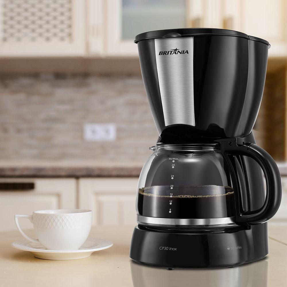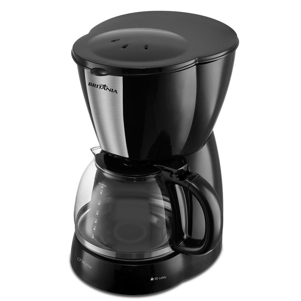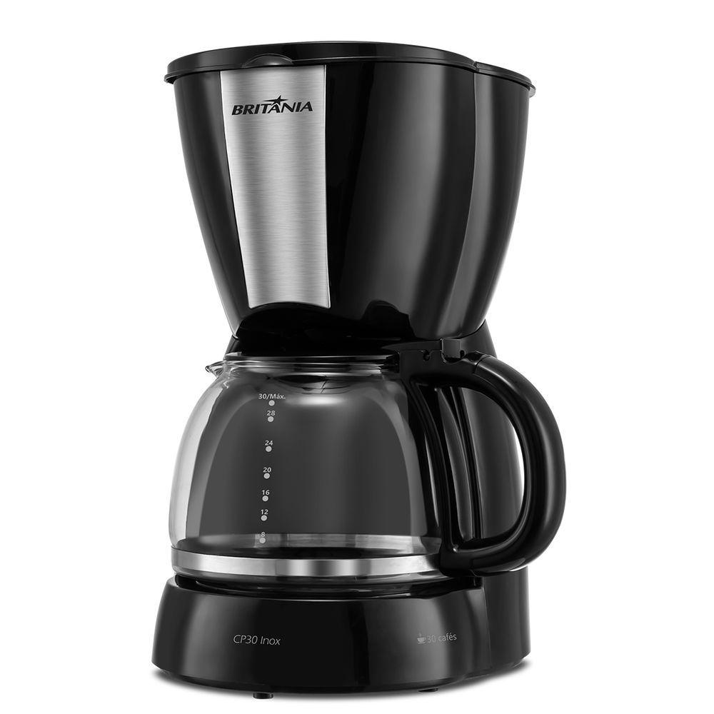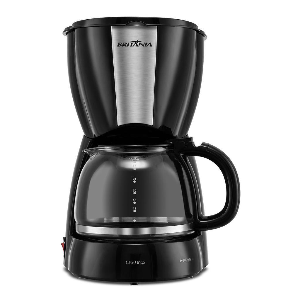 Cafeteira Britânia CP30 Inox Preta 110VCafeteira Britânia CP30 Inox Preta: Seu Café Perfeito a Qualquer HoraTransforme suas pausas em momentos deliciosos com a Cafeteira Elétrica Britânia CP30 Inox Preta. Ideal para quem ama compartilhar, esta cafeteira prepara até 30 xícaras de café, perfeita para receber amigos e familiares. Desfrute de um café sempre quente graças à sua eficiente placa aquecedora, que mantém a temperatura ideal por mais tempo. A praticidade é um destaque: com filtro permanente e porta-filtro removível, você economiza e simplifica o preparo, eliminando a necessidade de filtros de papel. O sistema corta-pingos permite que você sirva seu café quando quiser, sem bagunça, mesmo durante o preparo. Com design moderno em acabamento inox e detalhes em preto, a Britânia CP30 complementa qualquer cozinha, unindo beleza e funcionalidade. Prepare seu café com a comodidade que você merece e eleve sua experiência com cada xícara. A jarra de vidro, além de elegante, pode ser levada diretamente à mesa, facilitando o serviço.Especificações Potência: 800W Capacidade: 30 cafezinhos Capacidade do Reservatório de Água: 1,2L Sistema Corta-Pingo: Sim Filtro: Permanente Placa de Aquecimento: Sim Voltagem: 127V Consumo: 0,80 kW/h Itens Inclusos Cafeteira Britânia CP30 Inox Preta Colher Dosadora Perguntas Frequentes (FAQ) Pergunta: A cafeteira possui timer?Resposta: Não, este modelo não possui a função timer. Pergunta: A jarra pode ser levada ao fogão?Resposta: Não, a jarra é de vidro e pode ser levada à mesa, mas não é adequada para uso direto no fogão. Pergunta: Qual o período de garantia do produto?Resposta: A Cafeteira Britânia CP30 possui garantia de 360 dias (12 meses) contra defeitos de fabricação. Produto: Cafeteira | Voltagem: 127V