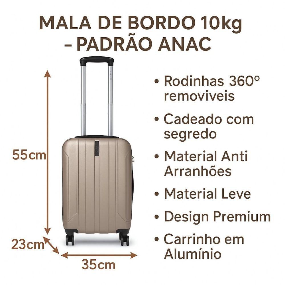 Mala De Viagem De Bordo P/ 10kg Em Abs Com Rodinhas 360º Removíveis E Leve - Padrão Anac - Qualis Champanhe Mb003Descrição do produto Marca: QualisModelo: MB001 / MB002 / MB003Material: ABS resistente à impactos e riscosTamanho: De bordo 10kgIndicação: Ideal para levar à bordoCarrinho puxador: Embutido em alumínio anti ferrugem com regulagens de alturaRodinhas: 4 rodas duplas com giro 360º para maior conforto no manuseioTipo de rodinhas: RemovíveisCadeado: Sim, embutido com segredo numérico de 3 dígitos para maior segurançaAlça: Superior emborrachada para maior conforto ao carregarFecho: Zíper duplo para maior praticidadeImpermeável: SimOrganização interna: Divisória e cinta elástica fixadoraForro interno: Completamente forrada com tecido resistenteEspecificações (medidas dentro do padrão da ANAC)Altura: 55 cm contando as rodas e alça (padrão ANAC)Largura: 35 cmProfundidade: 23 cmCapacidade em volume: 40 LPeso: 2,3 kgDiâmetro das rodinhas: 5 cmViaje com segurança e estilo com a mala de bordo Qualis, feita em ABS resistente, ideal para suportar impactos e proteger seus pertences. Com capacidade para até 10kg, é perfeita para quem busca praticidade e eficiência em viagens curtas ou negócios.- Rodinhas 360º removíveis para maior mobilidade e versatilidade- Design leve que facilita o transporte sem abrir mão da robustez- Padrão ANAC, garantindo compatibilidade com as principais companhias aéreas- Alça retrátil em alumínio com pegada confortável, proporcionando manuseio fácil- Acabamento sofisticado com detalhes em tom caramelo, unindo funcionalidade e elegânciaConquiste mais liberdade e organização em suas viagens com a mala que combina design moderno, durabilidade e praticidade. Ideal para quem não abre mão de qualidade e estilo na hora de embarcar.Mala de Viagem de Bordo 10kg – Elegância, Resistência e Conforto para Suas Viagens ?Viajar com praticidade e estilo ficou muito mais fácil com a Mala de Bordo 10kg. Com design moderno e detalhes sofisticados em couro sintético, ela é a companheira perfeita para viagens curtas, negócios ou lazer. Compacta, leve e resistente, garante conforto e segurança em cada destino.? Compatível com as principais companhias aéreasCom dimensões de 55cm x 35cm x 23cm, está dentro do padrão ANAC para bagagem de mão. Ideal para evitar taxas de despacho e manter seus pertences sempre por perto durante o voo. Design PremiumDisponível em cores exclusivas a mala combina sofisticação e funcionalidade, se destacando em qualquer viagem. Organização Inteligente Amplo espaço interno com divisórias Elásticos que mantêm as roupas firmes e sem amassar Segurança GarantidaEquipada com cadeado embutido, oferece proteção extra para seus pertences durante toda a viagem. Mobilidade Sem Esforço 4 Rodas duplas 360° para deslizar em qualquer superfície sem esforço Alça retrátil ajustável em diferentes alturas Alças superiores e laterais reforçadas para facilitar o manuseio Durabilidade e ResistênciaFabricada em material rígido de alta qualidade (ABS), é leve, resistente a impactos e perfeita para acompanhar você em muitas viagens. Benefícios que fazem diferença: Tamanho ideal para viagens rápidas Padrão ANAC para bagagem de mão (10kg) Rodas 360° que garantem praticidade Segurança com cadeado integrado Design sofisticado e exclusivo Disponível em várias cores elegantes