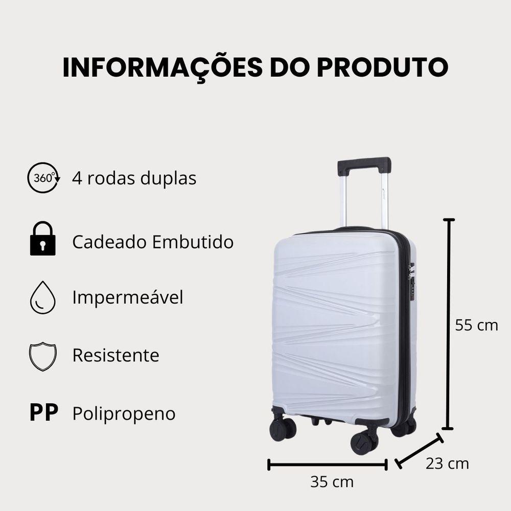 Mala De Bordo 10kg Viagem Zíper Expansível Em Polipropileno Rodinhas 360º Tsa - Bocaiúva - Cruzeiro GeloMarca: CruzeiroModelo: BocaiúvaMaterial: Polipropileno inquebrável resistente à impactos e riscosTamanho: Mala de bordo 10kgZíper expansível: Sim, expansível em 30% de capacidadeIndicação: Ideal para levar à bordo em viagens de avião, ideal para viagens de carro, trem, ônibus e metrôCarrinho puxador: Embutido em alumínio antiferrugem com regulagens de alturaRodinhas: 4 rodas duplas com giro 360º para maior conforto no manuseioTipo de rodinhas: RemovíveisCadeado: Embutido com segredo numérico de 3 dígitos para maior segurançaAlça: Superior para maior conforto ao carregarFecho: Zíper duplo para maior praticidade e segurançaImpermeável: SimOrganização interna: Divisória e cinta elástica fixadoraBolso interno: Contém bolso interno na divisória da malaForro interno: Completamente forrada com poliéster resistentePés de apoio laterais: SimPossui TSA: SimEspecificações da mala (medidas dentro do padrão da ANAC)Medidas com expansor fechado: 55 cm x 35 cm x 23 cm - contando as rodas e alça (padrão ANAC)Medidas com expansor aberto: 55 cm x 35 cm x 27 cm - contando as rodas e alça (padrão ANAC)Capacidade em volume: 40 litros (expansor fechado) / 52 litros (expansor fechado)Peso: 2.4 kgDiâmetro das rodinhas: 5 cmFabricada em polipropileno resistente, a mala garante durabilidade e proteção contra impactos.As rodinhas duplas 360º da mala proporcionam mobilidade suave e confortável, facilitando o deslocamento em qualquer superfície.O cadeado embutido oferece segurança reforçada para seus pertences.A mala é ideal para quem busca leveza, organização e resistência em um só produto.Principais benefícios desse modelo:Capacidade para 10kg e divisória internaMaterial em polipropileno resistente e leveRodinhas duplas giratórias 360º para máxima mobilidadeCadeado embutido para proteção dos seus itensDesign compacto, ideal para cabine de aviãoPerguntas Frequentes1. Essa mala é aceita como bagagem de mão nas companhias aéreas?Sim. A mala segue o padrão ANAC, sendo aceita como bagagem de mão em todas as companhias aéreas nacionais e internacionais.2. Qual é o peso máximo permitido dentro da mala?O limite de peso varia conforme a companhia aérea, mas geralmente é de até 10kg para bagagem de bordo.3. Qual o material da mala?As malas são feitas em polipropileno de alta resistência, materiais leves, duráveis e que oferecem proteção contra impactos e arranhões.4. A mala tem cadeado?Sim. Possui cadeado embutido com segredo numérico, garantindo maior segurança para sua bagagem.5. As rodinhas giram 360°?Sim. As rodinhas são multidirecionais 360°, o que facilita a movimentação em qualquer direção e garante praticidade no transporte.6. A alça é resistente?Sim. Conta com alça telescópica em alumínio, além da alça fixa e lateral, garantindo conforto e resistência.7. Qual a capacidade da mala em litros?A capacidade é de 45L, ideal para viagens curtas ou de fim de semana.8. Essa mala risca fácil?Não. Os materiais utilizados possuem acabamento que ajuda a minimizar riscos e arranhões comuns durante viagens.9. Tem garantia?Sim. Todas as malas possuem garantia de fábrica, assegurando qualidade e tranquilidade para o cliente.10. Qual o prazo de postagem?O prazo de postagem é de no máximo 1 dia útil, podendo ser no mesmo dia da compra.11. A embalagem é resistente?Sim. Todas as nossas malas são enviadas em caixas de papelão resistentes, assim sua mala será enviada e transportada com segurança, evitando danos e chegando em perfeito estado.