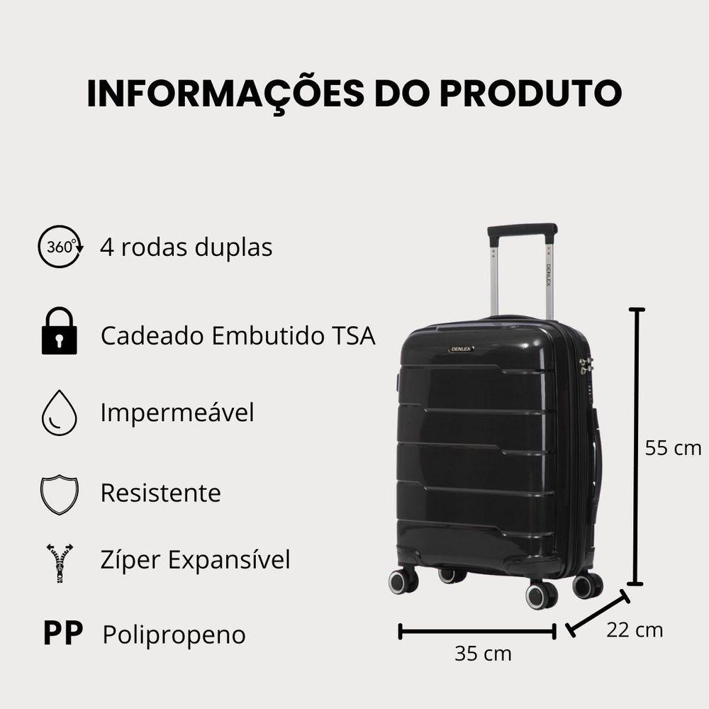 Mala De Bordo 10kg Viagem Zíper Expansível Em Polipropileno Rodinhas 360º Tsa - Lima - Denlex Cor PretoMarca: DenlexModelo: LimaMaterial: Polipropileno inquebrável resistente à impactos e riscosTamanho: Mala de 10kgZíper expansível: SimIndicação: Ideal para levar à bordo em viagens de avião, ideal para viagens de carro, trem, ônibus e metrôCarrinho puxador: Embutido em alumínio antiferrugem com regulagens de alturaRodinhas: 4 rodas duplas com giro 360º para maior conforto no manuseioTipo de rodinhas: FixasCadeado: Embutido com segredo numérico de 3 dígitos para maior segurança (Tsa)Alça: Superior e lateral para maior conforto ao carregarFecho: Zíper duplo para maior praticidade e segurançaImpermeável: SimOrganização interna: Divisória e cinta elástica fixadoraBolso interno: Contém bolso interno na divisória da malaForro interno: Completamente forrada com poliéster resistentePés de apoio laterais: SimPossui TSA: SimEspecificações da mala (medidas dentro do padrão da ANAC)Medidas com expansor fechado: 55cm x 35cm x 22cm - contando as rodas e alça (padrão ANAC)Medidas com expansor aberto: 55cm x 35cm x 25cm - contando as rodas e alça (padrão ANAC)Capacidade em volume: 42 litros (expansor fechado) - 48 litros (expansor aberto)Peso: 2,5kgDiâmetro das rodinhas: 5 cmFabricada em polipropileno resistente, a mala garante durabilidade e proteção contra impactos.As rodinhas duplas 360º da mala proporcionam mobilidade suave e confortável, facilitando o deslocamento em qualquer superfície.O cadeado embutido TSA oferece segurança reforçada para seus pertences.A mala é ideal para quem busca leveza, organização e resistência em um só produto.Principais benefícios desse modelo: Capacidade para 10kg e divisória interna Material em polipropileno resistente e leve Rodinhas duplas giratórias 360º para máxima mobilidade Cadeado embutido para proteção dos seus itens Perguntas Frequentes1. Essa mala é aceita como bagagem de mão nas companhias aéreas?Sim. A mala segue o padrão ANAC, sendo aceita como bagagem de mão em todas as companhias aéreas nacionais e internacionais.2. Qual é o peso máximo permitido dentro da mala?O limite de peso varia conforme a companhia aérea, mas geralmente é de até 10kg para bagagem de bordo.3. Qual o material da mala?As malas são feitas em polipropileno de alta resistência, materiais leves, duráveis e que oferecem proteção contra impactos e arranhões.4. A mala tem cadeado?Sim. Possui cadeado embutido com segredo numérico TSA, garantindo maior segurança para sua bagagem.5. As rodinhas giram 360°?Sim. As rodinhas são multidirecionais 360°, o que facilita a movimentação em qualquer direção e garante praticidade no transporte.6. A alça é resistente?Sim. Conta com alça telescópica em alumínio, além da alça fixa e lateral, garantindo conforto e resistência.7. Qual a capacidade da mala em litros?A capacidade é de 48L, ideal para viagens curtas ou de fim de semana.8. Essa mala risca fácil?Não. Os materiais utilizados possuem acabamento que ajuda a minimizar riscos e arranhões comuns durante viagens.9. Tem garantia?Sim. Todas as malas possuem garantia de fábrica, assegurando qualidade e tranquilidade para o cliente.10. Qual o prazo de postagem?O prazo de postagem é de no máximo 1 dia útil, podendo ser no mesmo dia da compra.11. A embalagem é resistente?Sim. Todas as nossas malas são enviadas em caixas de papelão resistentes, assim sua mala será enviada e transportada com segurança, evitando danos e chegando em perfeito estado.