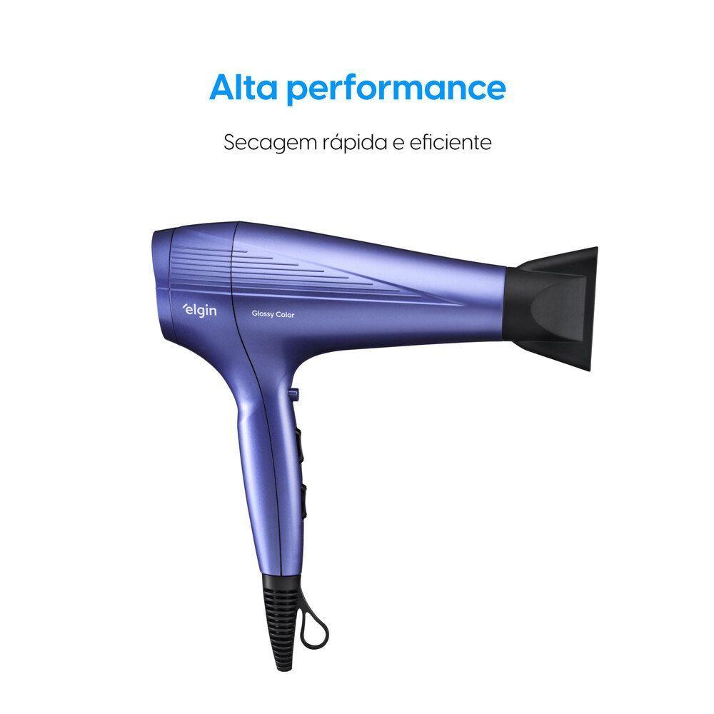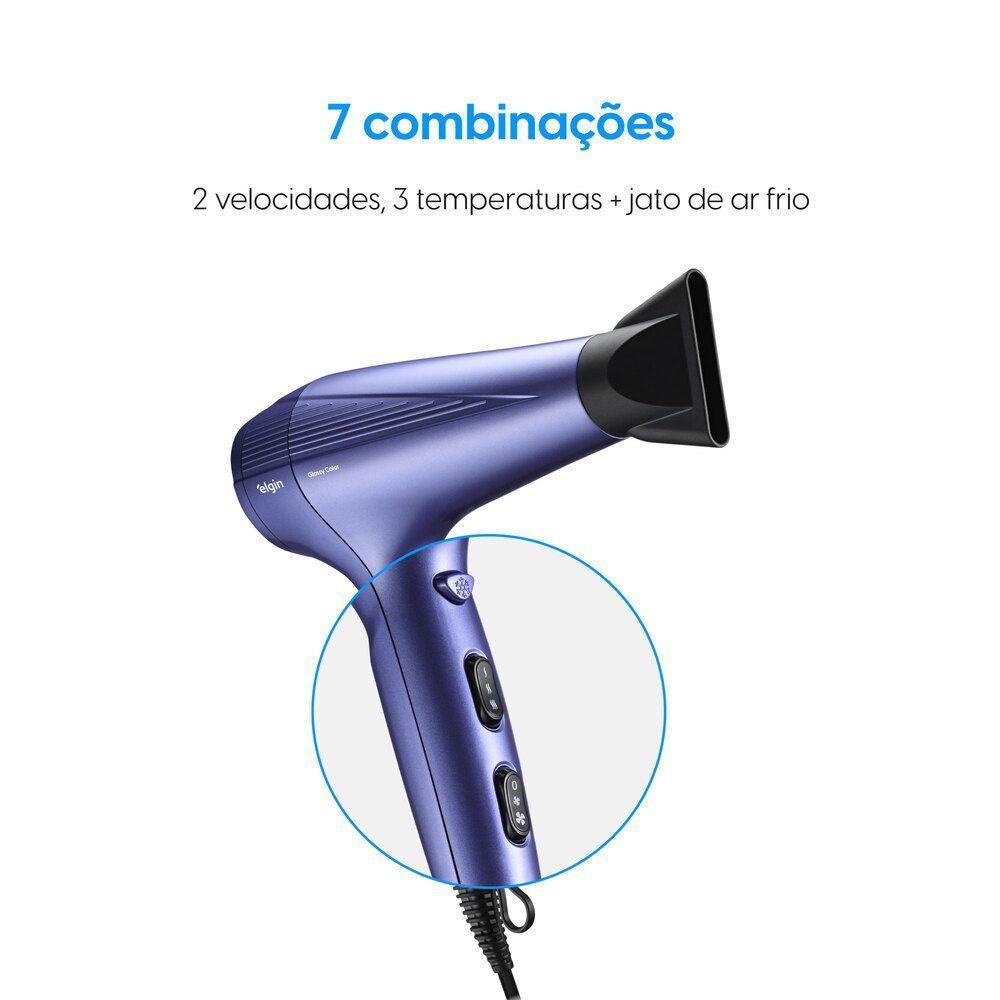 Secador Glossy Color - 2 Velocidades 3 Temperaturas Jato de Ar Frio 2.000W 110VTransforme sua rotina de cuidados capilares com o Secador de Cabelo Glossy Color, a escolha ideal para uma secagem rápida e eficiente. Com uma potência de 2.000W e voltagem de 110V, ele garante alta performance, proporcionando resultados incríveis em casa.O Secador Glossy Color oferece 2 velocidades e 3 temperaturas, além da função Cool Shot. São 7 combinações que permitem ajustar o secador conforme a necessidade dos seus fios, proporcionando maior controle e versatilidade. O motor DC oferece desempenho confiável e duradouro, garantindo que o secador atenda às suas necessidades diárias de forma eficaz. Com uma alça prática para pendurar, você pode armazenar o secador de forma conveniente ou deixá-lo pendurado enquanto o utiliza.A Elgin oferece garantia expressa de 1 ano.Características:Tourmaline Íon2.000W de potênciaFunção Cool Shot (jato de ar frio)Bocal concentrador7 combinações: 2 velocidades, 3 temperaturasGrade traseira removívelAnel para pendurarCordão elétrico de 2 metrosMotor DCGarantia expressa de 1 anoEspecificações Técnicas:Nome do produto: Secador Glossy Color - 2 Velocidades 3 Temperaturas Jato de Ar Frio 2.000W 110VVoltagem: 127vCor: RoxoPotência (W): 2000Velocidades: 7 combinações: 2 velocidades, 3 temperaturas + Jato de ar frioTourmaline Ion: SIM, libera íons negativos, selando as cutículas dos fios deixando o cabelo macio e brilhanteAcompanha bocal concentrador: SIM, direciona o fluxo de ar facilitando a secagem e modelagemEAN: 7908412504631