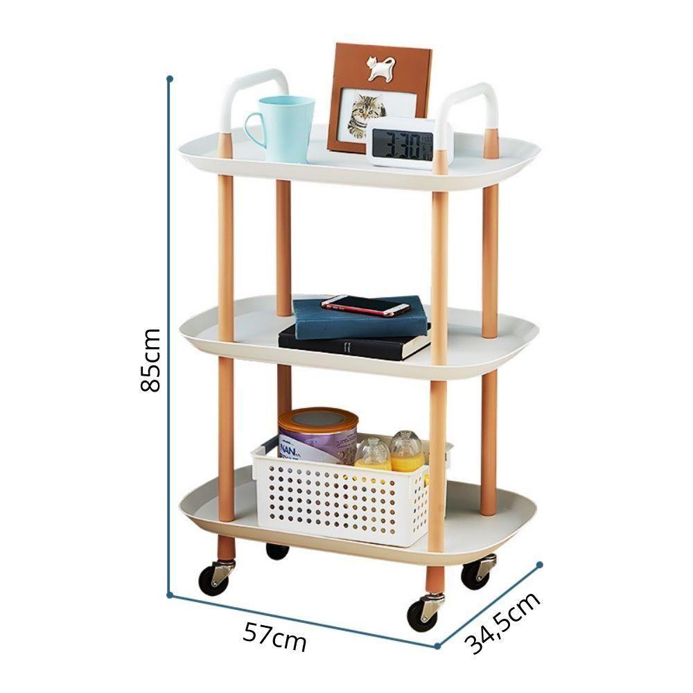 Carrinho Organizador Multiuso 3 Prateleiras Mesa Auxiliar Rack Portatil Rodizios Madeira Decoracao Varanda Cozinha SalaCarrinho Organizador Multiuso 3 Prateleiras com RodasO Carrinho Organizador com 3 Prateleiras é a solução ideal para quem busca praticidade e organização no dia a dia. Com estrutura leve e resistente, ele pode ser utilizado em diversos ambientes como cozinha, lavanderia, banheiro, escritório, despensa, salão de beleza e muito mais.Seu design moderno e funcional combina com qualquer ambiente, oferecendo praticidade para armazenar e transportar utensílios, mantimentos, produtos de limpeza e objetos pessoais de forma eficiente e segura.Diferenciais:Estrutura reforçada em plástico e metal;3 prateleiras espaçosas para melhor organização;4 rodas com giro 360° para fácil movimentação;Visualização e acesso rápido aos objetos;Compacto, ideal para otimizar espaços pequenos;Fácil de montar e transportar.Especificações:Material: Metal e plásticoCor: BrancoDimensões aproximadas: - Altura: 85 cm - Largura: 34,5 cm - Comprimento: 57 cmConteúdo da Embalagem:01 Carrinho Organizador Multiuso 3 prateleirasImagens meramente ilustrativas.Carrinho Organizador Multiuso 3 Prateleiras com RodasO Carrinho Organizador com 3 Prateleiras é a solução ideal para quem busca praticidade e organização no dia a dia. Com estrutura leve e resistente, ele pode ser utilizado em diversos ambientes como cozinha, lavanderia, banheiro, escritório, despensa, salão de beleza e muito mais.Seu design moderno e funcional combina com qualquer ambiente, oferecendo praticidade para armazenar e transportar utensílios, mantimentos, produtos de limpeza e objetos pessoais de forma eficiente e segura.Diferenciais:Estrutura reforçada em plástico e metal;3 prateleiras espaçosas para melhor organização;4 rodas com giro 360° para fácil movimentação;Visualização e acesso rápido aos objetos;Compacto, ideal para otimizar espaços pequenos;Fácil de montar e transportar.Especificações:Material: Metal e plásticoCor: BrancoDimensões aproximadas: - Altura: 85 cm - Largura: 34,5 cm - Comprimento: 57 cmConteúdo da Embalagem:01 Carrinho Organizador Multiuso 3 prateleirasImagens meramente ilustrativas.