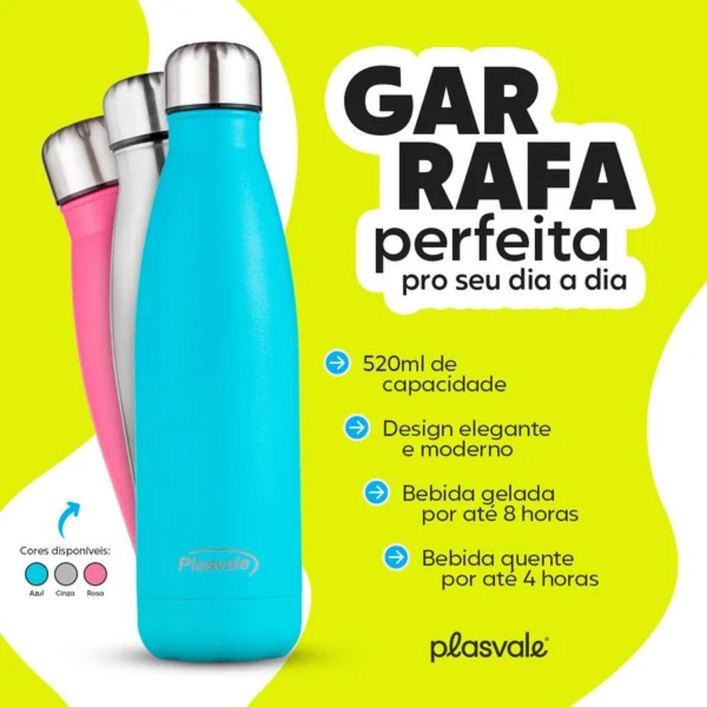 Garrafa Térmica De Inox Parede Dupla 520ml Plasvale InoxA garrafa perfeita para ser a sua companheira em todos os momentos do dia. Com seu formato slim e fácil de carregar, pode ser levado para a caminhada, academia, trabalho, escola e em todos os lugares que você precisar tomar uma água sempre gelada.Com sua tecnologia de isolamento à vácuo com parede dupla de aço inox, mantém a bebida sempre na temperatura ideal até o último gole. Possui tampa de vedação hermética, com silicone, que garante uma melhor vedação, pode colocar na bolsa sem medo, que não vaza! A textura, em soft touch, deixa o seu uso mais confortável, além de trazer elegância e beleza para a garrafa. É a escolha ideal para quem busca praticidade aliada ao estilo. Dimensões: Dimensões: 7,1 x 26,5 cm (Diâmetro x Altura) Capacidade: 520ml Peso: 0,285 Kg Material: Aço Inoxidável Temperatura: - Até 4 Horas - Até 8 Horas - Até 17 HorasA Plasvale é uma empresa de utilidade doméstica que trabalha com amor na criação, qualidade, sustentabilidade e tecnologia de seus produtos. Nosso objetivo é estar presente nos lares e tornar a vida de nossos clientes mais fácil, prática e feliz.