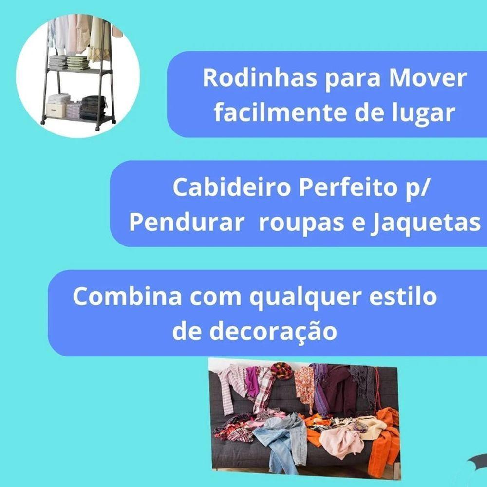 Estante Organizadora Cabideiro Arara Guarda Roupas Cabide MuEstante Organizadora Multiuso com Cabideiro e 2 Prateleiras | Portátil com Rodinhas | 55x42x160cm – Cor PretaA Estante Organizadora Multiuso 2 Prateleiras com 1 Cabideiro é a solução ideal para quem busca organização, mobilidade e aproveitamento de espaço em um único produto. Com rodinhas com trava, ela é fácil de mover e se adapta a qualquer cômodo da casa, como quarto, lavanderia, closet, ateliê ou até ambientes comerciais.Versátil, leve e resistente, conta com 2 prateleiras amplas para roupas, toalhas, sapatos ou objetos diversos, além de cabideiro superior para pendurar roupas de forma prática. Seu design compacto combina funcionalidade e estilo, mantendo seus itens organizados e sempre à mão.Principais vantagens:Multiuso: ideal para roupas, calçados, cama, banho e objetos diversosPrateleiras + cabideiro: solução completa em um só produtoPortátil com rodinhas e travas: mobilidade e segurança no usoEstrutura leve, fácil de montar e desmontar (sem ferramentas)Design compacto e moderno que se adapta a qualquer ambienteMelhor custo-benefício para quem quer organização práticaEspecificações técnicas:Dimensões montada: 55 cm (largura) x 42 cm (profundidade) x 160 cm (altura)Peso aproximado: 1,475 kgMaterial: Ferro, PP (plástico resistente), TNT (tecido)Cor: PretoMarca: CasítaValidade: IndeterminadaMontagem: Manual incluso, sem necessidade de ferramentasConteúdo da embalagem:1 Estante organizadora com 2 prateleiras, 1 cabideiro e rodinhasInstruções de conservação:Limpar com pano macio levemente umedecido ou aspirador de póNão utilizar produtos abrasivos, alvejantes ou solventesManter longe do fogo