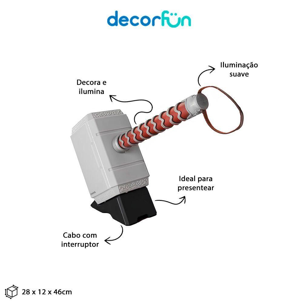 Luminária 3d Mjolnir Do Thor - Decoração Heroica Para Seu Espaço!Descubra a Luminária 3D Martelo do Thor, um item decorativo indispensável para os verdadeiros fãs do universo Marvel. Com um design que retrata com precisão o icônico martelo Mjolnir, esta luminária transcende a função de uma simples fonte de luz, servindo como uma peça que adiciona caráter e sofisticação a qualquer ambiente.Confeccionada com materiais de alta qualidade, a Luminária 3D Martelo do Thor não só replica a aparência impressionante do famoso objeto, mas também oferece um efetivo toque realista. Seus detalhes meticulosos capturam a essência do , tornando-a uma excelente adição a estantes, mesas de cabeceira ou a qualquer espaço de trabalho, permitindo que você insira uma dose de aventura e mitologia no seu dia a dia.O funcionamento deste abajur é simples e prático, garantindo uma utilização descomplicada no cotidiano. Com um sistema de iluminação suave, ele proporciona uma luz agradável, perfeita para estudos, trabalhos ou para criar um ambiente acolhedor durante momentos de relaxamento. Além de iluminar, transforma-se em uma peça central impactante na decoração.Além disso, a Luminária 3D Martelo do Thor é uma escolha ideal para eventos e festas temáticas. Seja em um encontro com amigos, uma maratona de filmes da Marvel ou uma comemoração especial, este objeto singular certamente surpreenderá seus convidados. Ele adiciona um toque criativo e divertido às suas celebrações, tornando-se o ponto focal da atenção.Versátil e estilosa, esta luminária se adapta a diversos estilos de decoração, desde o moderno até o rústico. Ela é com diferentes ambientes, como dormitórios, salas de estar e home offices. A presença do abajur não apenas ilumina, mas também transforma o espaço em um mais convidativo e inspirador.Ao escolher a Luminária 3D Martelo do Thor, você não apenas adquire um produto que simboliza a cultura pop e o amor por histórias de heróis, mas também a oportunidade de expressar sua personalidade e interesses em seu espaço pessoal. Complete sua coleção de memorabilia da Marvel e faça deste abajur uma parte essencial de sua decoração.