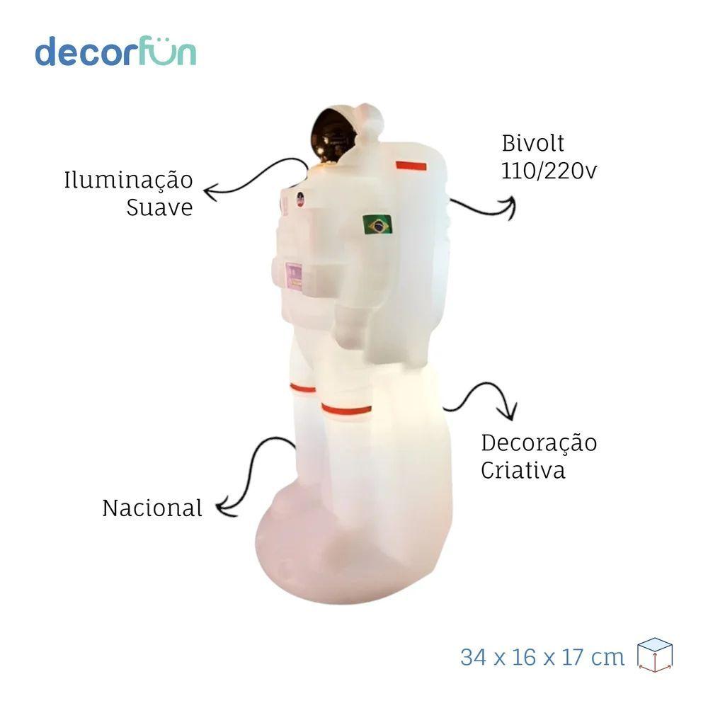 Luminária Astronauta 3d: Iluminação Criativa E Charmosa Para Ambientes ModernosLeve o do universo sideral direto para dentro de casa com a Luminária Astronauta 3D. Com design criativo e acabamento cheio de detalhes, ela é perfeita para quem adora decoração diferenciada e moderna. A viseira dourada metalizada e os detalhes personalizados da roupa tornam a peça ainda mais realista e charmosa, ideal para compor ambientes descolados, quartos infantis, escritórios e espaços criativos.Além de ser um item decorativo incrível, a luminária garante iluminação suave e agradável, tornando-se o ponto de destaque em qualquer bancada ou cantinho especial.• Design criativo e temático, inspirado no universo espacial.• Detalhes realistas: viseira metalizada dourada e adesivos personalizados.• Decoração versátil: perfeita para quartos, escritórios ou ambientes criativos.• com lâmpadas LED ou fluorescentes (E-27).• Alimentação bivolt com cabo de 1,8m e interruptor de mão.• Material resistente em polietileno.Especificações do produto:Uso: Decorativo, para bancadas e mesasDimensões: 34 x 16 x 17 cm (A x L x P)Material: PolietilenoIluminação: com lâmpadas LED até 10W ou fluorescentes compactas até 10W (E-27) – não inclusasTensão: Bivolt (110V/220V)Alimentação: Cabo de força com 1,8m e interruptorRecomendações: Limpar com pano úmido e macio; evitar químicos e abrasivos; não utilizar lâmpadas incandescentes