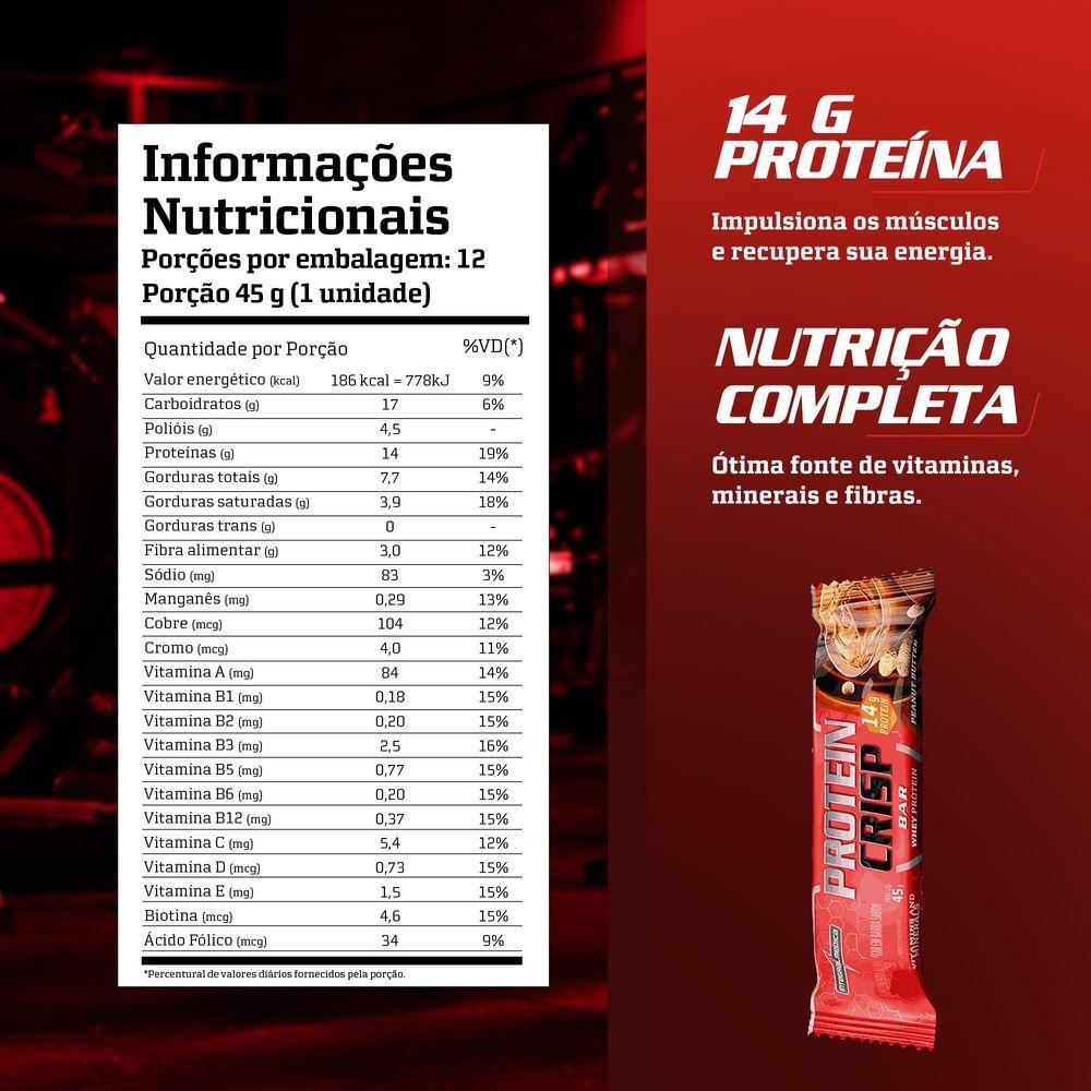 Barra Proteína Whey Crisp Bar 12 Unidades - Integralmedica Peanut ButterDeu vontade de comer doce sem sair da dieta? Protein Crisp Integralmédica é a barra de proteína com 13 g de proteína e baixa caloria. . Ótima fonte de vitaminas, minerais e fibras, ajuda a saciar a fome e evitar o catabolismo.Contém Glúten?: Não Contém | Lactose: Contém | Tipo de supemento: Proteína Hidrolisada | Tamanho: 45g | Formato do suplemento: Barra | Sabor: Variado | Classe de suplemento: Proteína | Ingredient list: BLEND PROTEICO [PROTEÍNA CONCENTRADA DO LEITE, PROTEÍNA CONCENTRADA DO SORO DE LEITE E PROTEÍNA HIDROLISADA (COLÁGENO)], PASTA DE AMENDOIM | Formulário de item: Tábua | Alimentos contendo enzimas e probióticos: Não | Marca: Integralmedica | Função do suplemento: Nutricional/Esportivo | Código de registro sanitário da Anvisa: 185/24 | Sabor: Peanut Butter