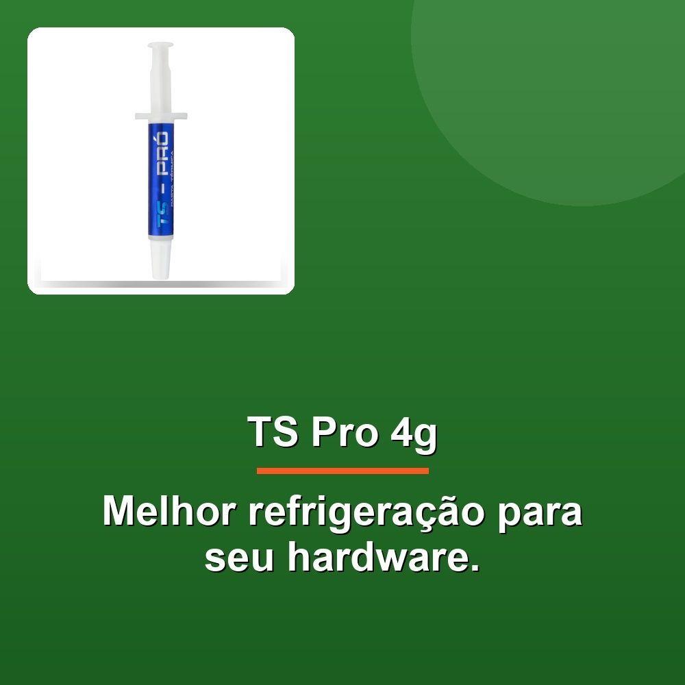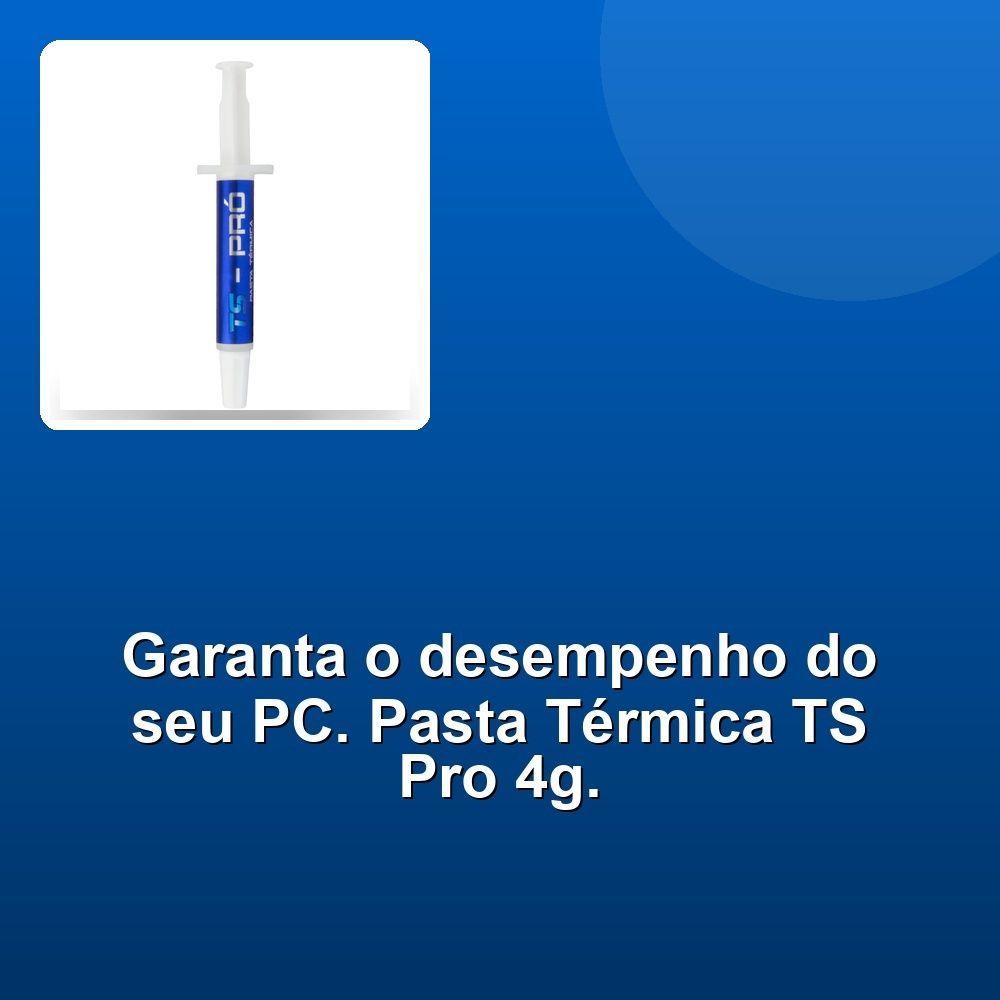 Pasta Térmica Ts Pro Cinza 4gA Pasta Térmica TS Pro Cinza 4 Gramas é a solução definitiva para garantir o máximo desempenho e longevidade dos seus componentes eletrônicos. Desenvolvida com uma fórmula moderna e inovadora, a TS Pro combina materiais de alta condutividade térmica com um fluído de silicone especial, proporcionando uma dissipação térmica excepcional.Sua consistência adequada garante fácil aplicação, evitando excesso e garantindo contato perfeito entre o componente e o cooler. Com uma condutividade térmica de 6,2 W/mk, a TS Pro garante a transferência eficiente do calor, prevenindo superaquecimento e extendendo a vida útil do seu processador, placa de vídeo e outros componentes.A pasta térmica TS Pro é ideal para uso em CPUs, placas de vídeo, consoles de videogame e qualquer aplicação que exige um desempenho térmico superior. A embalagem inclui uma seringa aplicadora para facilitar a aplicação, uma espátula para a remoção da pasta antiga e um sachê de álcool para garantir a limpeza dos componentes antes da aplicação da nova pasta. Experimente a TS Pro Cinza 4 Gramas e sinta a diferença no desempenho do seu equipamento.A Pasta Térmica TS Pro Cinza 4 Gramas é a solução definitiva para garantir o máximo desempenho e longevidade dos seus componentes eletrônicos. Desenvolvida com uma fórmula moderna e inovadora, a TS Pro combina materiais de alta condutividade térmica com um fluído de silicone especial, proporcionando uma dissipação térmica excepcional.Sua consistência adequada garante fácil aplicação, evitando excesso e garantindo contato perfeito entre o componente e o cooler. Com uma condutividade térmica de 6,2 W/mk, a TS Pro garante a transferência eficiente do calor, prevenindo superaquecimento e extendendo a vida útil do seu processador, placa de vídeo e outros componentes.A pasta térmica TS Pro é ideal para uso em CPUs, placas de vídeo, consoles de videogame e qualquer aplicação que exige um desempenho térmico superior. A embalagem inclui uma seringa aplicadora para facilitar a aplicação, uma espátula para a remoção da pasta antiga e um sachê de álcool para garantir a limpeza dos componentes antes da aplicação da nova pasta. Experimente a TS Pro Cinza 4 Gramas e sinta a diferença no desempenho do seu equipamento.