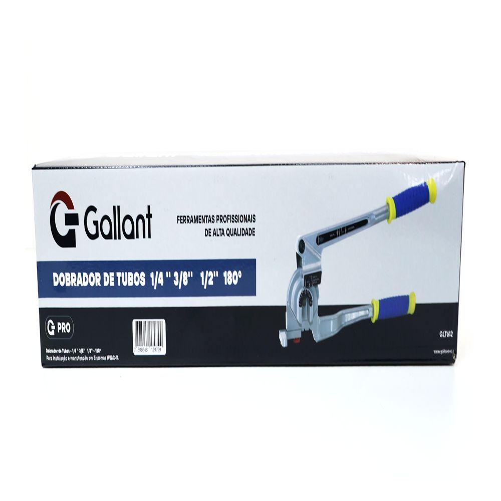 Dobrador de Tubos Gallant Pro 1/4 '' 3/8'' 1/2'' , 180O Dobrador de Tubos Gallant Pro 1/4'' 3/8'' 1/2'', 180 é a ferramenta ideal para profissionais que precisam de precisão e robustez na curvatura de tubos de cobre, latão e aluminio. Compatível com tubos de diametros 1/4'' 3/8'' 1/2'', é fabricado em antimônio e ferro de alta resistência, garantindo durabilidade e desempenho superior em campo.Permite curvaturas limpas e uniformes em ângulos de até 180°, sendo indispensável para serviços de instalação e manutenção em sistemas de refrigeração, hidráulica e ar-condicionado.Especificações Técnicas:Marca: Gallant Modelo: GLT612 Cor: Metálico Dimensões do Produto (LxAxP): 42 cm X 46 cm X 31 cmPeso Líquido: 1,450 KgPeso Bruto: 1,6 KgGarantia: 3 meses