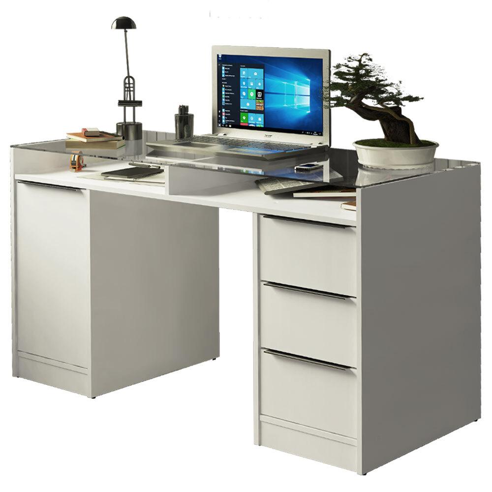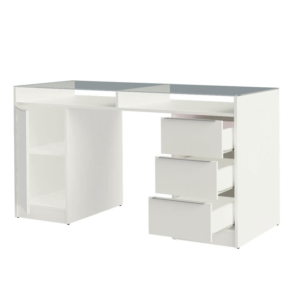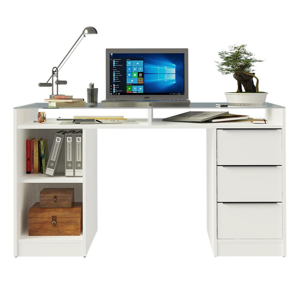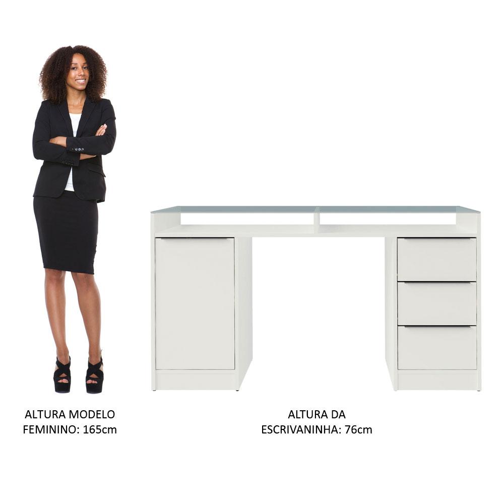 Na hora do trabalho ou do estudo, nada como ter um cantinho aconchegante para deixar você mais confortável. A Escrivaninha Madesa Chicago é a escolha perfeita para o seu quarto ou escritório.O tampo de vidro é um diferencial que agrega beleza e resistência ao móvel. Conta com 1 porta convencional e 3 gavetas com corrediças metálicas, permitindo uma ótima organização de materiais como cadernos, livros, pastas e o que mais você quiser. Além disso, possui 2 nichos abaixo do tampo, otimizando ainda mais o espaço útil. Também pode ser usada como mesa de apoio ou para notebook e PC.Possui acabamento branco, feito em Pintura Poliéster de alta resistência, exclusiva e patenteada. Consiste na aplicação de 7 camadas de proteção resistentes a álcool, água e calor. A pintura é ecológica, isenta de vapores que vão para a atmosfera. A parte exterior das costas não possui pintura.(Imagem meramente ilustrativa. A cadeira e todos os outros objetos decorativos não acompanham o produto.)Dimensões do produto: 76 cm de altura x 136 cm de largura x 60 cm de profundidade.Código do produto: 6912093Obs.: A Madesa não disponibiliza serviço de montagem. O produto segue com manual de instalação e todas as ferragens necessárias para sua montagem.A Madesa se dedica à sustentabilidade com várias iniciativas: temos uma usina própria para gerar energia que abastece uma de nossas fábricas. Selecionamos nossos fornecedores, priorizando aqueles que possuem um compromisso com a sustentabilidade e proteção do meio ambiente. Todo o plástico utilizado no setor produtivo é proveniente de reciclagem e as suas sobras são encaminhadas ao fornecedor que os recicla. Também investimos no desenvolvimento contínuo de nossos colaboradores e em ações educacionais que beneficiem a comunidade.