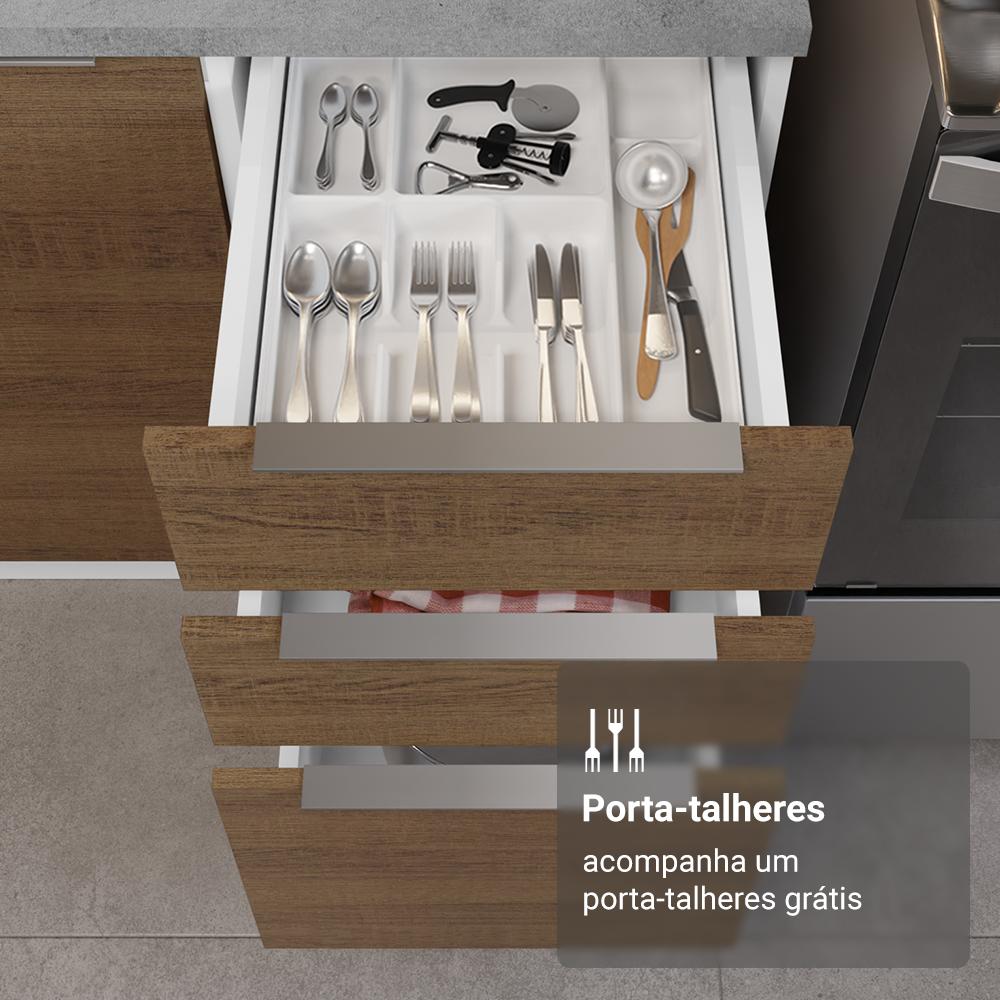 A Cozinha Completa Stella da Madesa combina design clássico e minimalista, oferecendo elegância e versatilidade para qualquer ambiente.O móvel é equipado com puxadores slim em alumínio e gavetas com corrediças telescópicas, que abrem totalmente. Já as portas possuem amortecimento, proporcionando um fechamento suave.O grande destaque fica por conta da cristaleira, que traz um toque refinado ao ambiente. Com duas portas de vidro, é ideal para expor suas louças, copos e objetos decorativos.Além do ótimo espaço disponível, esta cozinha é composta por módulos avulsos, o que permite uma adaptação perfeita ao seu ambiente.Medidas totais:- 225 cm de altura- 549 cm de largura- 52 cm de profundidade nos balcões e na torre e 31 cm nos aéreosO que você recebe:- Uma Cristaleira de 70 cm com duas portas- Um Balcão de 70 cm com duas portas e tampo- Um Aéreo de 120 cm com duas portas- Um Balcão de 120 cm com duas portas (Não possui tampo.)- Um Aéreo de Canto com uma porta- Um Balcão de Canto com uma porta e tampo- Uma Adega com quatro nichos- Um Aéreo de 80 cm com uma porta basculante- Um Balcão de 80 cm com duas portas e tampo- Um Aéreo de 60 cm com uma porta- Um Balcão de 60 cm com três gavetas e tampo- Um Organizador de talheres para gaveta- Uma Torre de 70 cm com três portas e dois nichos para fornos- Manual de montagem e ferragens necessáriasÉ bom saber:- A cristaleira não acompanha pés nem kit para suspender na parede. Deve ser instalada sobre o balcão e fixada na parede.- As imagens são meramente ilustrativas, os eletros e a decoração não acompanham o produto- A Madesa não oferece serviço de montagemA Madesa se dedica à sustentabilidade com várias iniciativas: temos uma usina própria para gerar energia que abastece uma de nossas fábricas. Selecionamos nossos fornecedores, priorizando aqueles que possuem um compromisso com a sustentabilidade e proteção do meio ambiente. Todo o plástico utilizado no setor produtivo é proveniente de reciclagem.