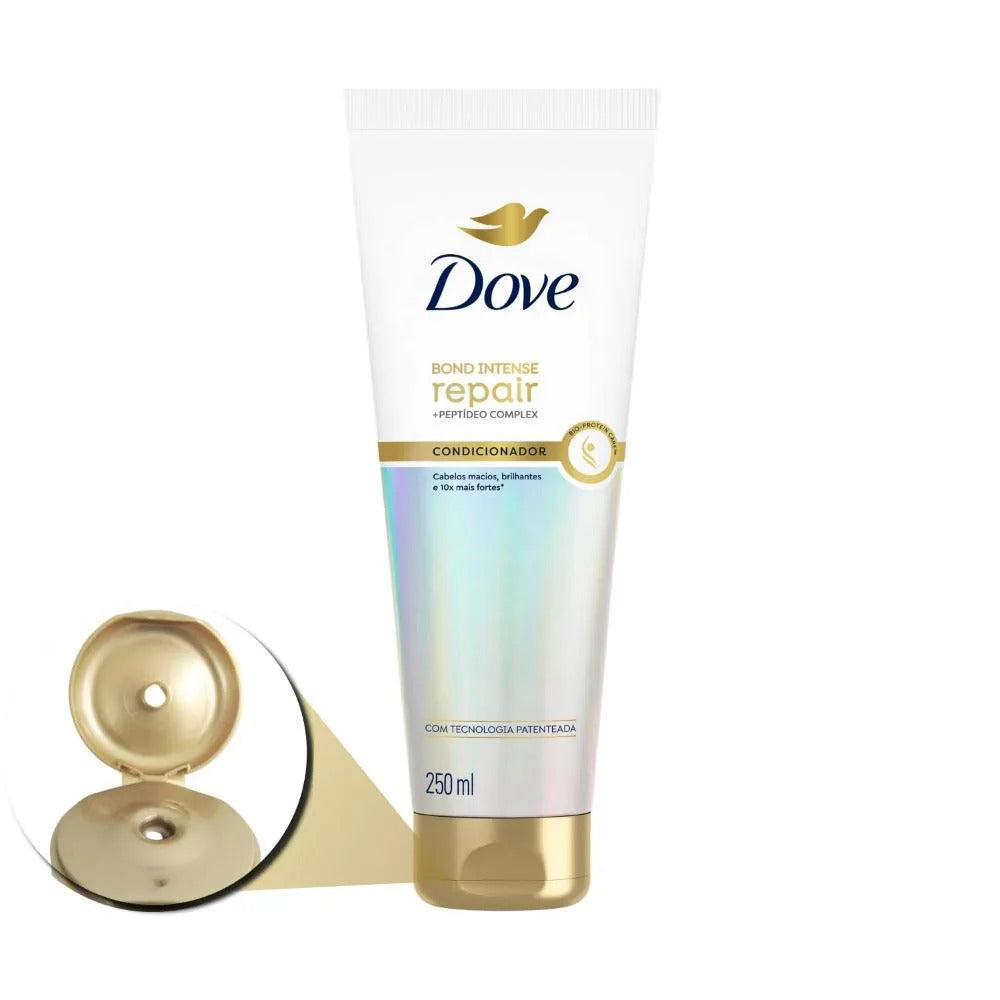 Para Que Serve:Condicionador Dove Bond Intense Repair 250ml O Condicionador Dove Bond Intense Repair possui a nova tecnologia patenteada Bio-Protein Care, proteína 100% compatível com a estrutura natural do cabelo, que age em harmonia com a biologia capilar e reverte os sinais do dano; e Peptídeo Complex, microcomponentes da proteína que conseguem atingir as camadas mais internas da fibra para restaurar as ligações rompidas a nível molecular. Juntos, reparam os sinais de dano dos fios a nível molecular desde o primeiro uso. A fórmula deste condicionador reconstrutor capilar possui uma textura cremosa que hidrata em profundidade enquanto repara a fibra capilar, para cabelos macios, saudáveis e brilhantes. O condicionador Dove Bond Intense Repair entrega nutrição para os cabelos, deixando-os 10x mais fortes*, 100% mais macios e com brilho extra. Modo de uso:Modo de uso: após o uso do shampoo, aplique sobre todo o comprimento dos fios, até as pontas. Deixe agir por um minuto e enxágue. Para melhores resultados, experimente também outros produtos para cabelos Dove Bond Intense Repair.