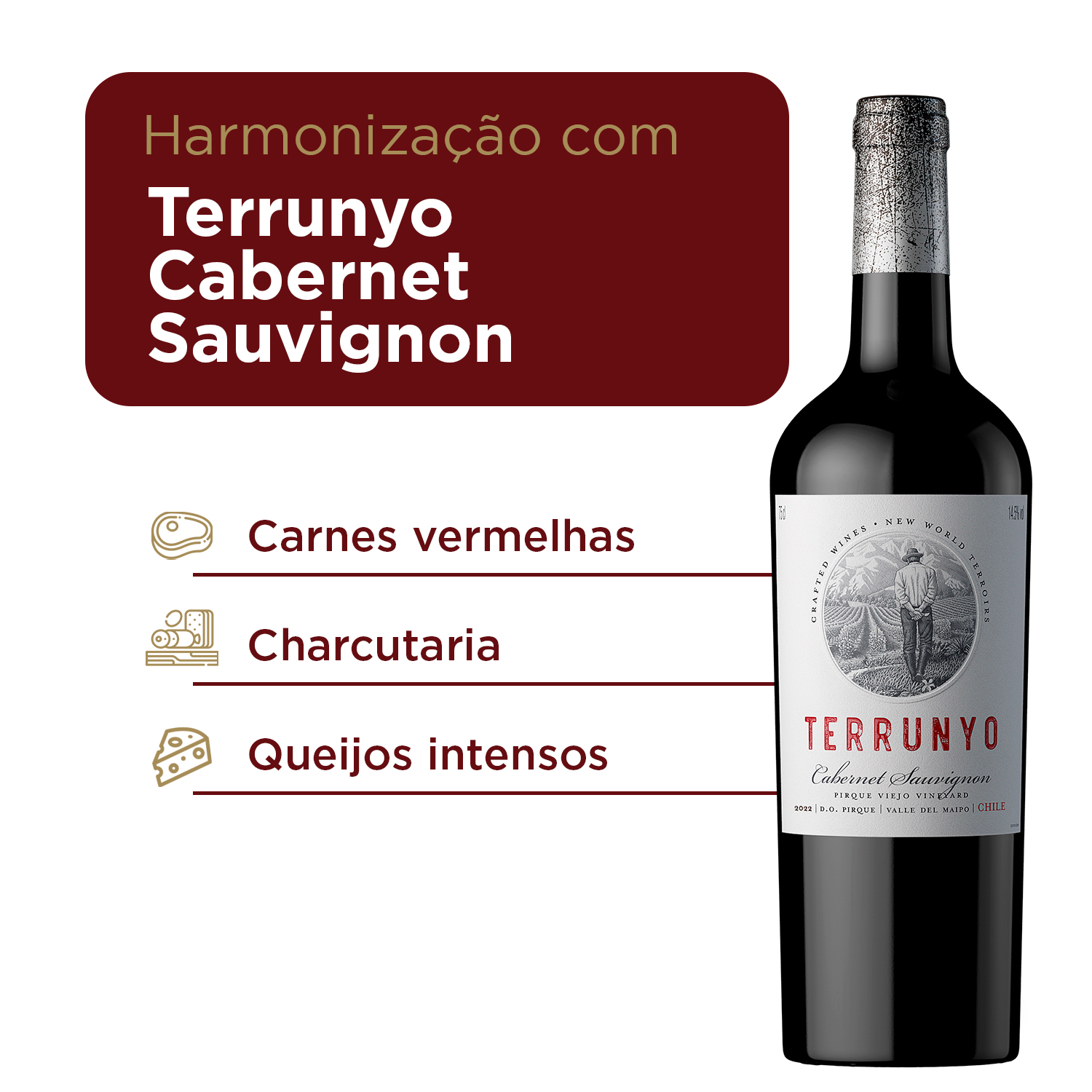 Precisão em cada taça com TerrunyoElegância e potência se encontram neste Vinho Terrunyo Cabernet Sauvignon que nasce aos pés da Cordilheira dos Andes, em um terroir de personalidade única.Sofisticação do vinhedo.Elaborado com uvas do vinhedo em Pirque, a 650m de altitude, influenciado pelo frescor dos Andes.Caráter expressivo.Notas intensas de mirtilo, cassis, grafite e chocolate, com toques herbáceos que ressaltam sua complexidade.Paladar vibrante e estruturado.Encorpado, com taninos firmes, acidez equilibrada e final persistente.Harmonização versátil.Perfeito com carnes, queijos fortes, ratatouille e até pratos vegetarianos como seitan e legumes.Excelência reconhecida.Presente entre os vinhos mais respeitados do Chile, Terrunyo é frequentemente destacado pela sofisticação de suas safras.Características:- Notas intensas de mirtilo, cassis, grafite e chocolate, com toques herbáceos- Encorpado, com taninos firmes, acidez equilibrada e final persistenteInformações Técnicas:- Volume: 750 ml- Tipo de vinho: Tinto- Uva: Cabernet Sauvignon- Origem: Chile