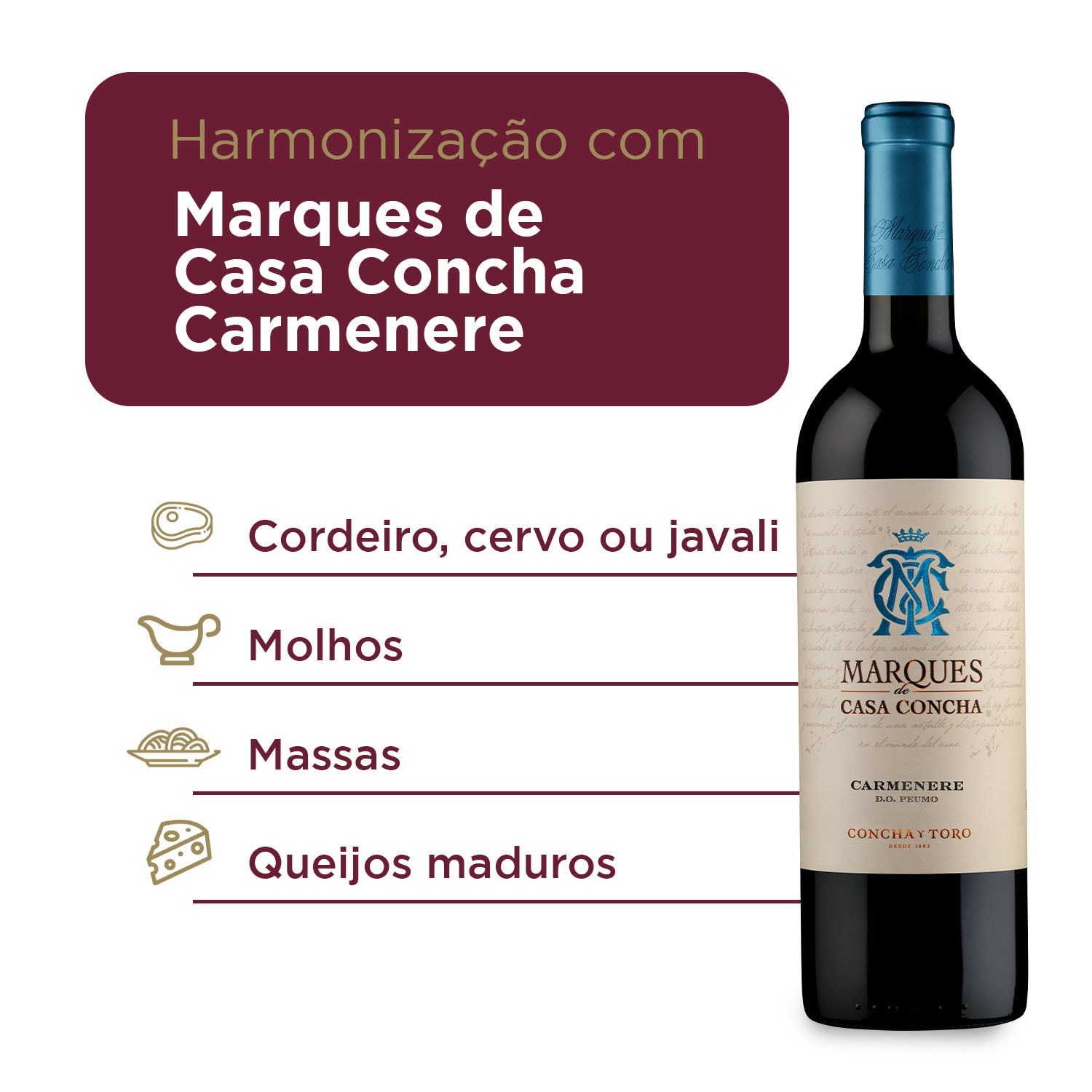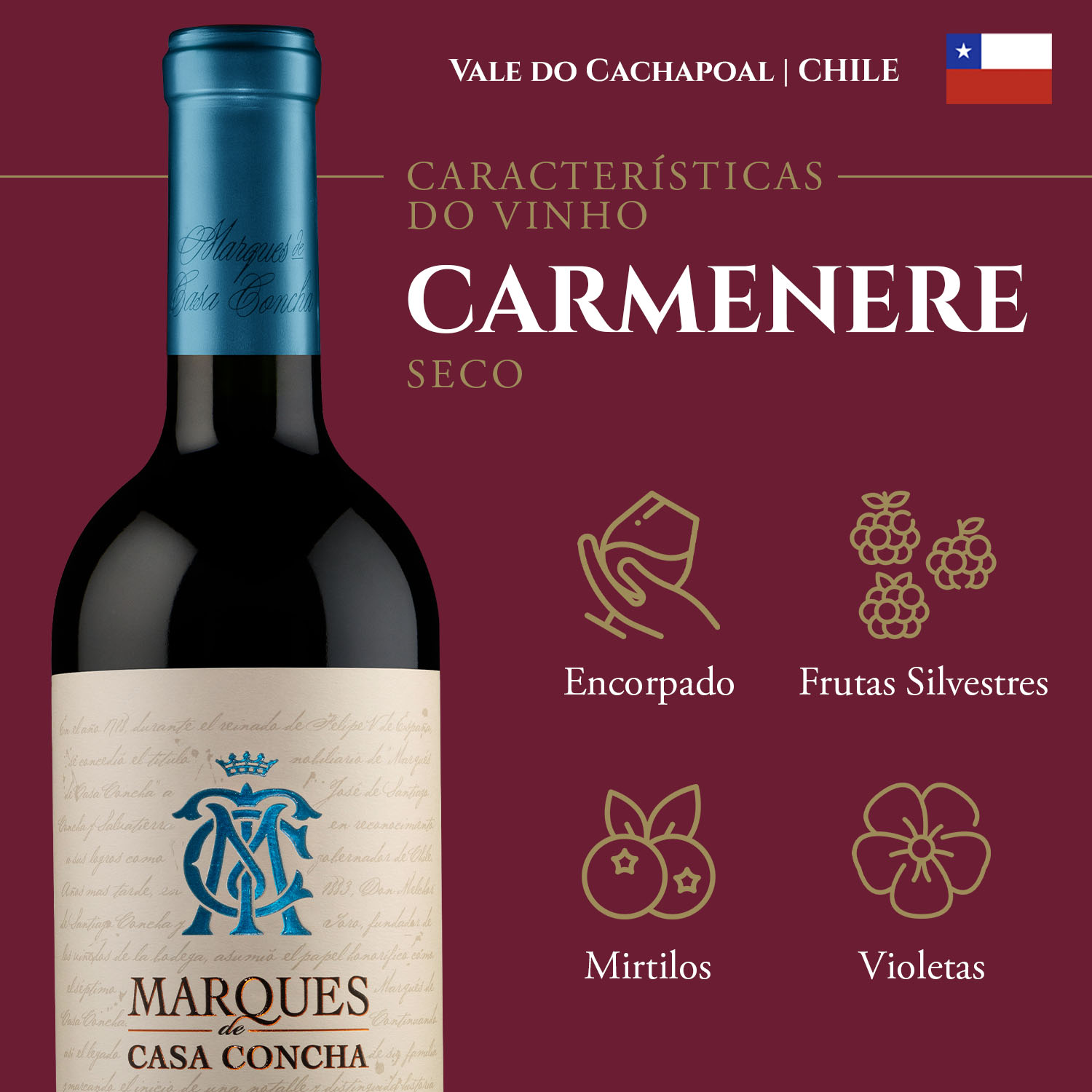 Marques De Casa Concha Carmenere: intensidade refinada de PeumoProduzido no renomado Vale do Cachapoal, na região de Peumo, o Marques de Casa Concha Carmenere é um exemplar que traduz toda a expressão e sofisticação dessa uva emblemática do Chile. Um vinho que revela equilíbrio, elegância e personalidade em cada taça.No nariz, entrega uma combinação encantadora de mirtilos, frutas silvestres e sutis notas de páprica e pimentão vermelho assado, características marcantes do Carmenere. Na boca, taninos macios, textura sedosa e um final longo e agradável completam a experiência.Assinado pela vinícola Concha y Toro, este vinho expressa tradição, inovação e o compromisso com a qualidade, traduzindo o melhor da elegância chilena em cada gole.Harmonização perfeita: carnes, massas bem temperadas, queijos curados e pratos de média intensidade encontram nesse Carmenere um parceiro que valoriza e realça cada sabor.Experimente a excelência Marques De Casa ConchaO Vinho Chileno Marques De Casa Concha Carmenere traduz a sofisticação em um vinho de caráter marcante. Produzido em Peumo, no Vale do Cachapoal, oferece intensos aromas de mirtilos, frutas silvestres, pitada de páprica e pimentão vermelho assado, com taninos suaves e final longo.O charme de um Carmenere.Um tinto chileno de 750 ml, feito com uvas Carmenere cultivadas em Peumo, no Vale do Cachapoal, reconhecido por produzir rótulos excepcionais.Intensidade e elegância.Apresenta de mirtilos, frutas silvestres, pitada de páprica e pimentão vermelho assado, com taninos suaves e final longo.Sabores que encantam.Harmoniza com cortes especiais de carnes, massas e queijos curados, realçando a riqueza de cada prato.Barricas de maturação.Os 12 meses em carvalho francês refinam os taninos e intensificam os aromas, garantindo profundidade ao Carmenere.Tradição e prestígio.Marques De Casa Concha expressa a tradição, a inovação e a paixão da vinícola Concha y Toro, criando vinhos de alto padrão que traduzem o sabor chileno.Características:- 100% uvas Carmenere de Peumo- Aromas de de mirtilos, frutas silvestres, pitada de páprica e pimentão vermelho assado- Taninos suaves e final longo- Harmoniza com carnes, massas e queijosInformações Técnicas:- Volume: 750 ml- Tipo de vinho: Tinto- Uva: Carmenere- Origem: Vale do Cachapoal - Chile