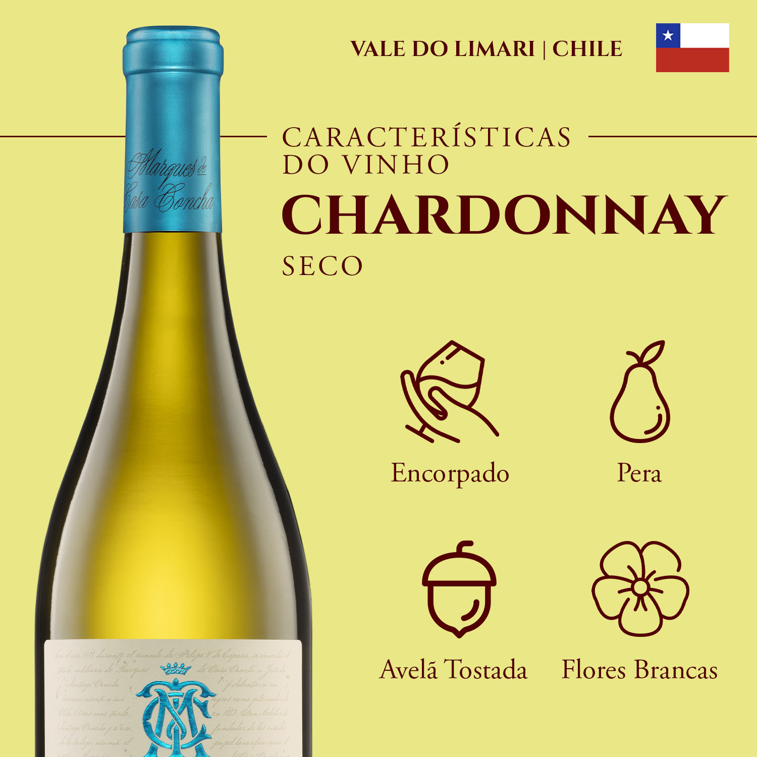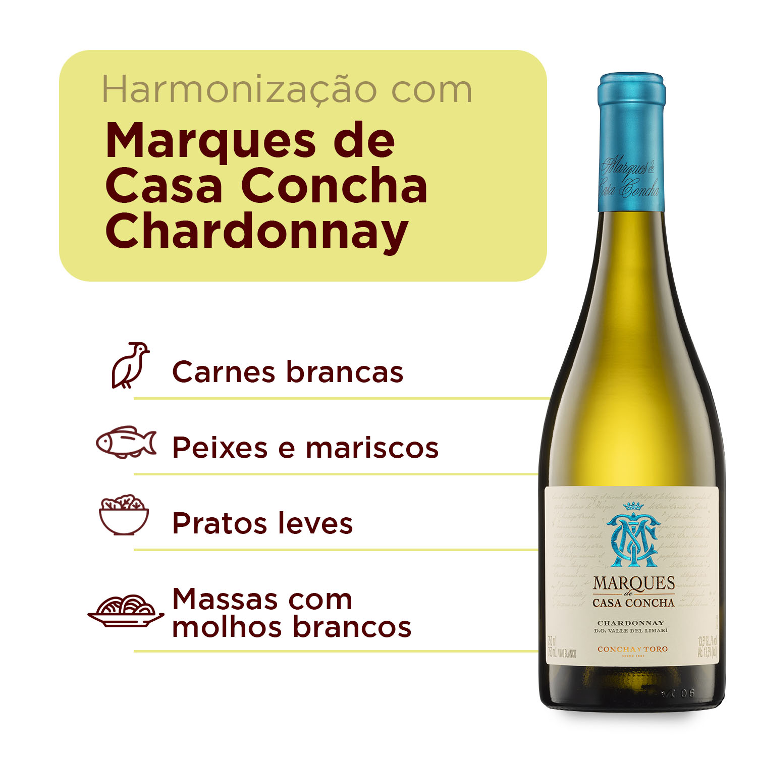 Marques De Casa Concha Chardonnay: equilíbrio refinado entre frescor e elegânciaProduzido no Vale do Limarí, no Chile, o Marques de Casa Concha Chardonnay é um vinho que entrega elegância, frescor e sofisticação em cada detalhe. Com uma combinação precisa entre acidez vibrante e textura cremosa, reflete a excelência da viticultura chilena em um rótulo de altíssimo padrão.No nariz, revela aromas de pera branca, figo e avelãs torradas, acompanhados por delicadas notas minerais e nuances sutis de carvalho. No paladar, oferece frescor equilibrado, cremosidade e um final sedoso, que encanta pela harmonia e pela riqueza de sabores.Assinado pela vinícola Concha y Toro, este vinho expressa tradição, inovação e o compromisso com a qualidade, traduzindo o melhor da elegância chilena em cada gole.Harmonização perfeita: frutos do mar, peixes, queijos macios e pratos sofisticados ganham ainda mais sabor e requinte ao lado desse branco complexo e refinado.Experimente a excelência Marques De Casa ConchaO Marques De Casa Concha Chardonnay revela a sofisticação do Vale do Limarí em uma interpretação elegante e refinada da uva Chardonnay. Com aromas de pera branca, figo e avelãs torradas, além de um toque mineral e acidez equilibrada, resultando em uma experiência marcante.Elegância em cada detalhe.Um Chardonnay chileno de 750 ml, nascido no Vale do Limarí, que combina frescor, final cremoso e aromas sofisticados em um equilíbrio perfeito.Camadas de sofisticação.Destaca notas de pera branca, figo e avelãs torradas, envolvidas por um toque mineral e nuances sutis de carvalho.Para experiências gastronômicas.Ideal para acompanhar frutos do mar, peixes e queijos, valorizando pratos com sua acidez equilibrada e final sedoso.Toque de carvalho na medida certa.Maturado por 12 meses em barricas de carvalho francês, revela um equilíbrio refinado entre frescor e suavidade.Tradição e prestígio.Marques De Casa Concha expressa a tradição, a inovação e a paixão da vinícola Concha y Toro, criando vinhos de alto padrão que traduzem o sabor chileno.Características:- 100% uvas Chardonnay do Vale do Limarí- Notas de pera branca, figo e avelãs torradas e um toque sutil de carvalho- Equilibrado e final cremoso- Harmoniza com frutos do mar, peixes e queijosInformações Técnicas:- Volume: 750 ml- Tipo de vinho: Branco- Uva: Chardonnay- Origem: Coquimbo - Chile