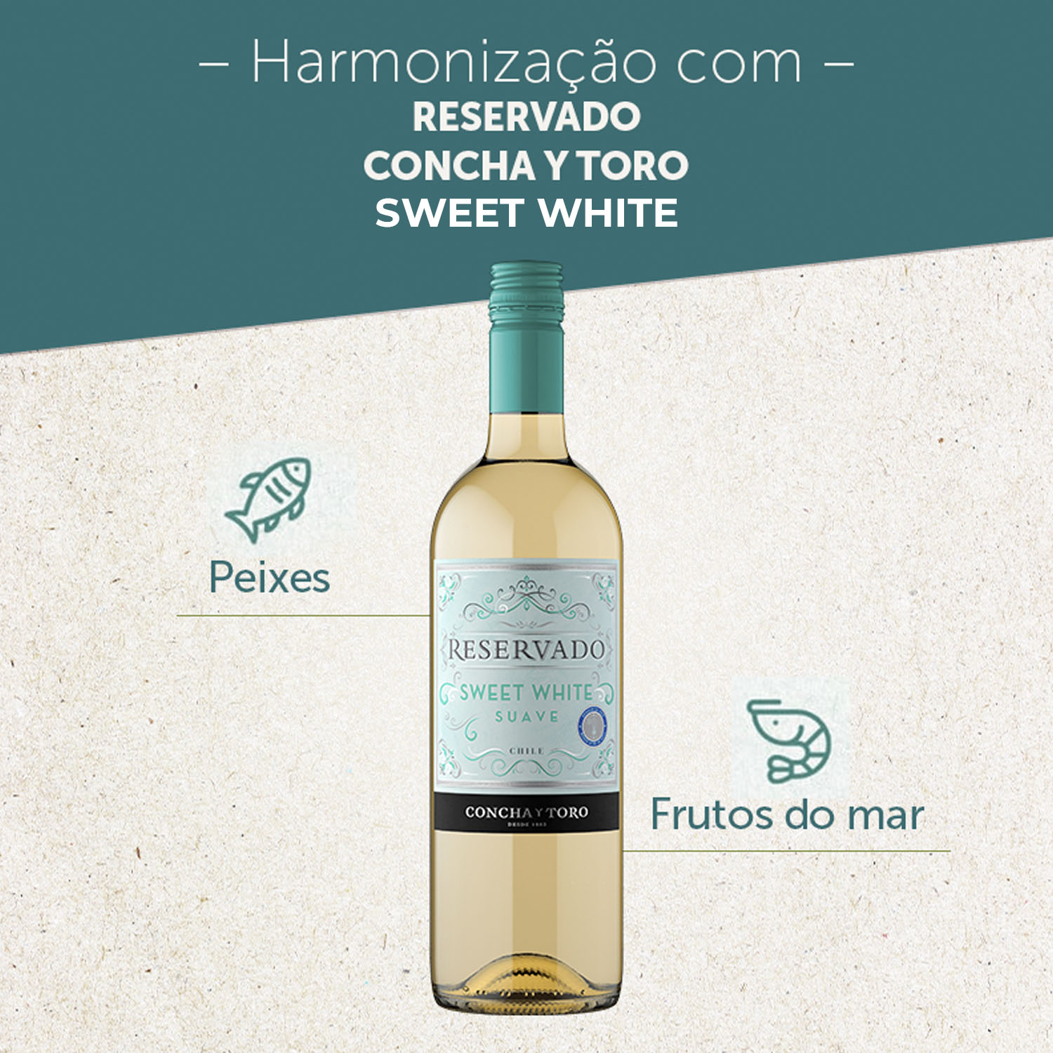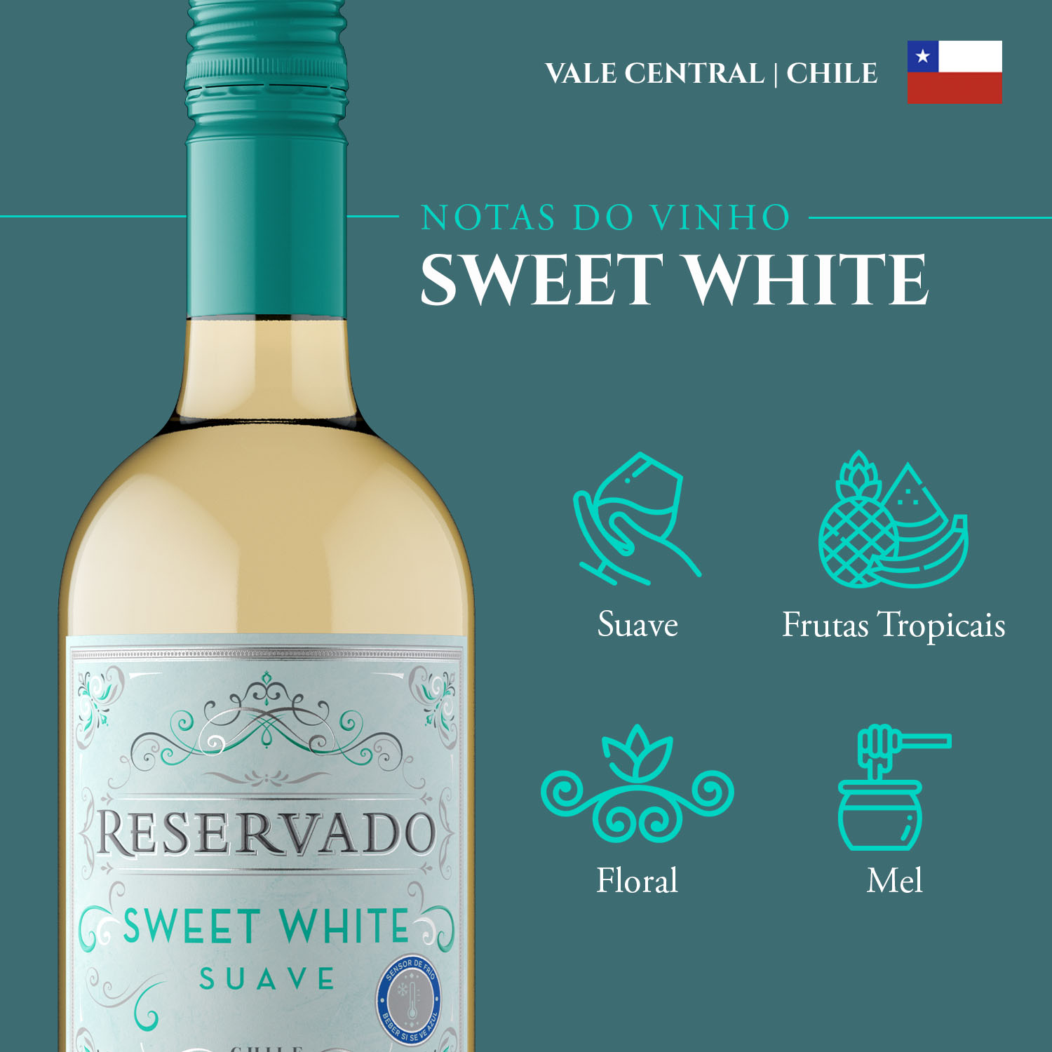 Reservado Sweet White: tropical, leve e suavemente doceDe cor clara e brilhante, com um amarelo pálido e reflexos esverdeados, o Reservado Sweet White revela leveza e frescor desde o primeiro gole. Esse vinho apresenta uma aparência vibrante que convida a uma experiência refrescante e delicada.No aroma, destacam-se notas elegantes de frutas tropicais maduras, com ênfase envolvente no abacaxi, que conferem um perfil aromático doce e cativante. No paladar, o vinho é suave e equilibrado, com sabor adocicado que se harmoniza perfeitamente com sua acidez, prolongando o frescor e a presença frutada a cada gole.A linha Reservado Spritzer traduz a qualidade e o espírito casual da Concha y Toro, trazendo vinhos que combinam frescor e suavidade para diversas ocasiões.Harmonização perfeita: acompanha sobremesas leves, como papaias em calda, cremes doces e aperitivos com frutas tropicais, realçando momentos doces e descontraídos.Uma experiência envolvente Concha y ToroDescubra a leve doçura e o frescor tropical do Reservado Sweet White, um vinho que transforma qualquer momento em celebração.Cor clara e brilhante.Amarelo claro com reflexos esverdeados que reforçam sua leveza e frescor desde a primeira prova.Aroma tropical elegante.Notas suaves de frutas tropicais maduras, com destaque envolvente para o abacaxi.Paladar doce e equilibrado.Sabor adocicado com acidez harmoniosa e notas tropicais que prolongam o sabor a cada gole.Ideal com sobremesas leves.Combina perfeitamente com papaias em calda, cremes doces e aperitivos com frutas tropicais.Qualidade Concha y Toro.A linha Reservado Sweet oferece vinhos leves, frutados e com final suavemente adocicado.Características:- Aromas de frutas tropicais e abacaxi- Harmoniza com papaias em calda, cremes doces e aperitivos com frutas tropicaisInformações Técnicas:- Volume: 750 ml- Tipo de vinho: Branco- Origem: Chile