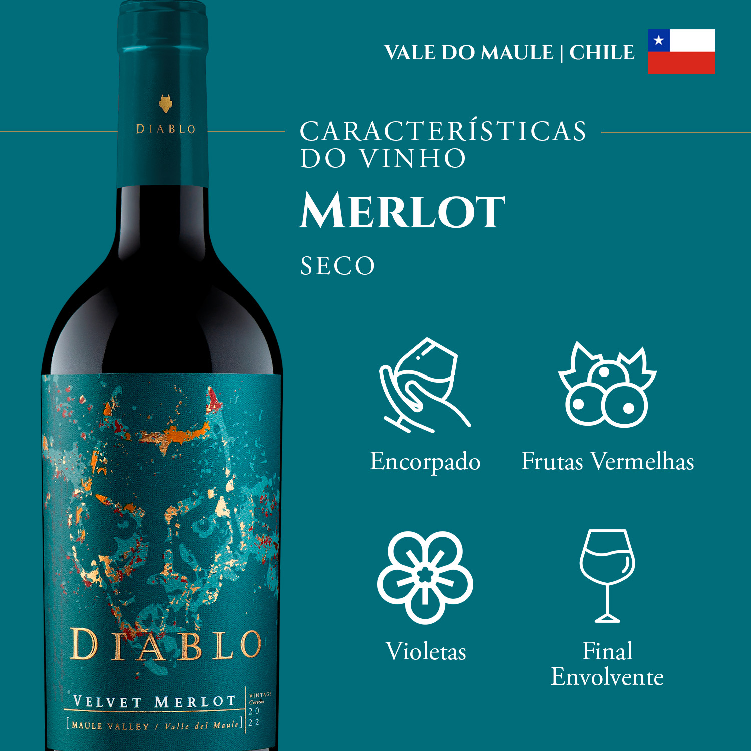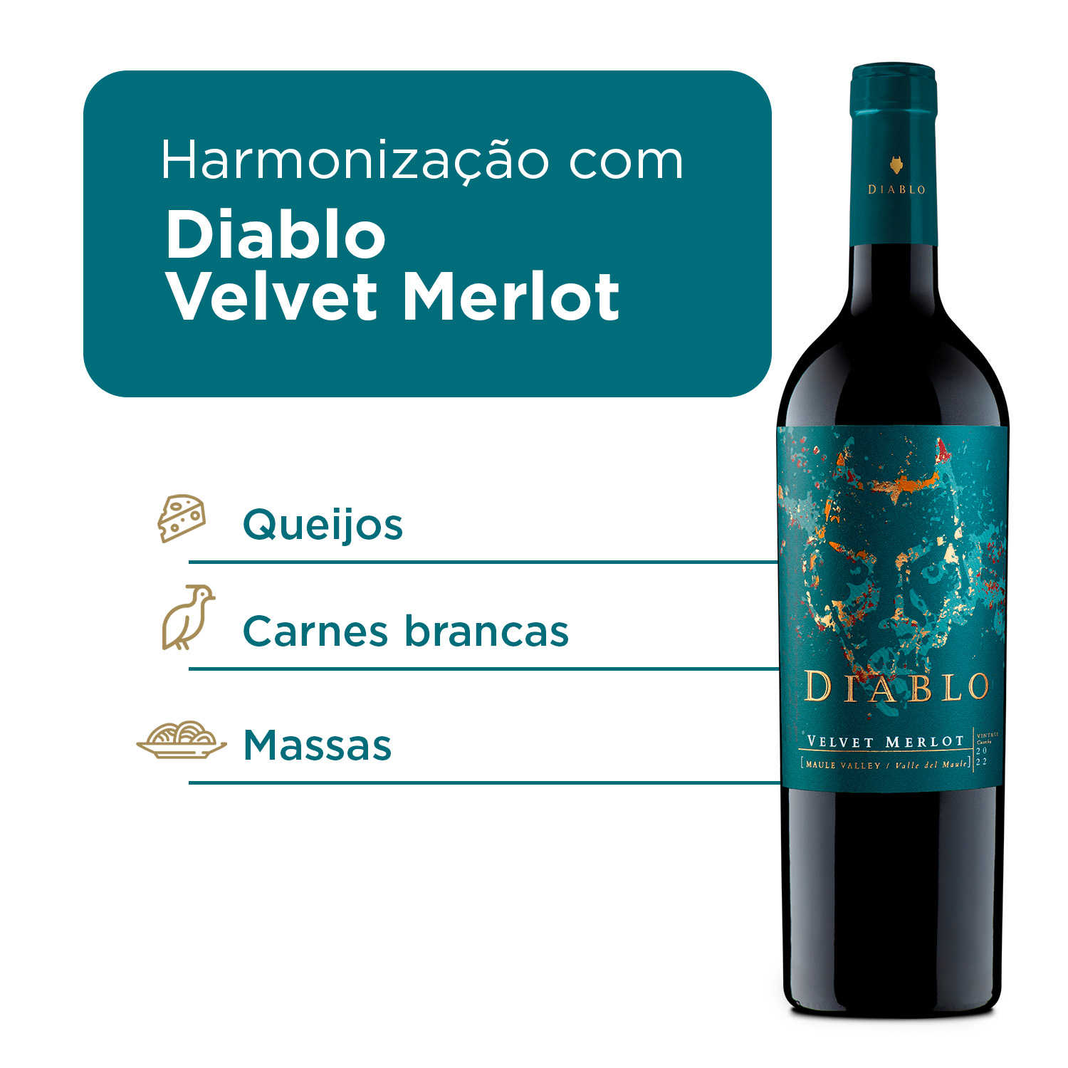 Conheça a autenticidade do vinho DiabloSedutor e envolvente, este Vinho Chileno Diablo Velvet Merlot revela a elegância do Vale do Maule com uma combinação irresistível de frutas vermelhas e textura aveludada.Intensidade que encanta.Sua coloração vermelha profunda com reflexos violetas já antecipa a complexidade do vinho, despertando os sentidos com elegância.Aromas envolventes.Frutas vermelhas maduras dominam o nariz, criando uma identidade marcante, convidativa e com notas que revelam sua origem.Paladar suculento.Textura aveludada e final persistente proporcionam uma experiência sensorial completa, com equilíbrio, riqueza e sofisticação.Harmonização versátil.Harmoniza com massas, carnes brancas e queijos variados, trazendo leveza, elegância e charme em diferentes ocasiões.Uma marca que encanta.Diablo é sinônimo de intensidade e personalidade, oferecendo vinhos que encantam paladares exigentes e elevam qualquer ocasião.Características:- 100% uvas Merlot do Vale do Maule- Aromas de frutas vermelhas maduras- Taninos equilibrados- Harmoniza com massas, carnes brancas e queijos variadosInformações Técnicas:- Volume: 750 ml- Tipo de vinho: Tinto- Uva: Merlot- Origem: Vale do Maule - ChileDiablo Velvet Merlot: maciez, intensidade e charme em cada goleIntensidade que encanta. Sua coloração vermelha profunda com reflexos violetas antecipa a complexidade deste Merlot, despertando os sentidos com uma elegância marcante e cativante. Aromas envolventes de frutas vermelhas maduras criam uma identidade rica e convidativa, que reflete a origem do vinho.No paladar, apresenta uma textura aveludada e um final persistente, proporcionando uma experiência sensorial completa, equilibrada, rica e sofisticada, perfeita para diferentes momentos.Diablo é uma marca que representa intensidade e personalidade, oferecendo vinhos que agradam paladares exigentes e elevam qualquer momento a uma experiência especial.Harmonização perfeita: acompanha massas, carnes brancas e queijos variados, trazendo leveza, elegância e charme a diversas ocasiões.