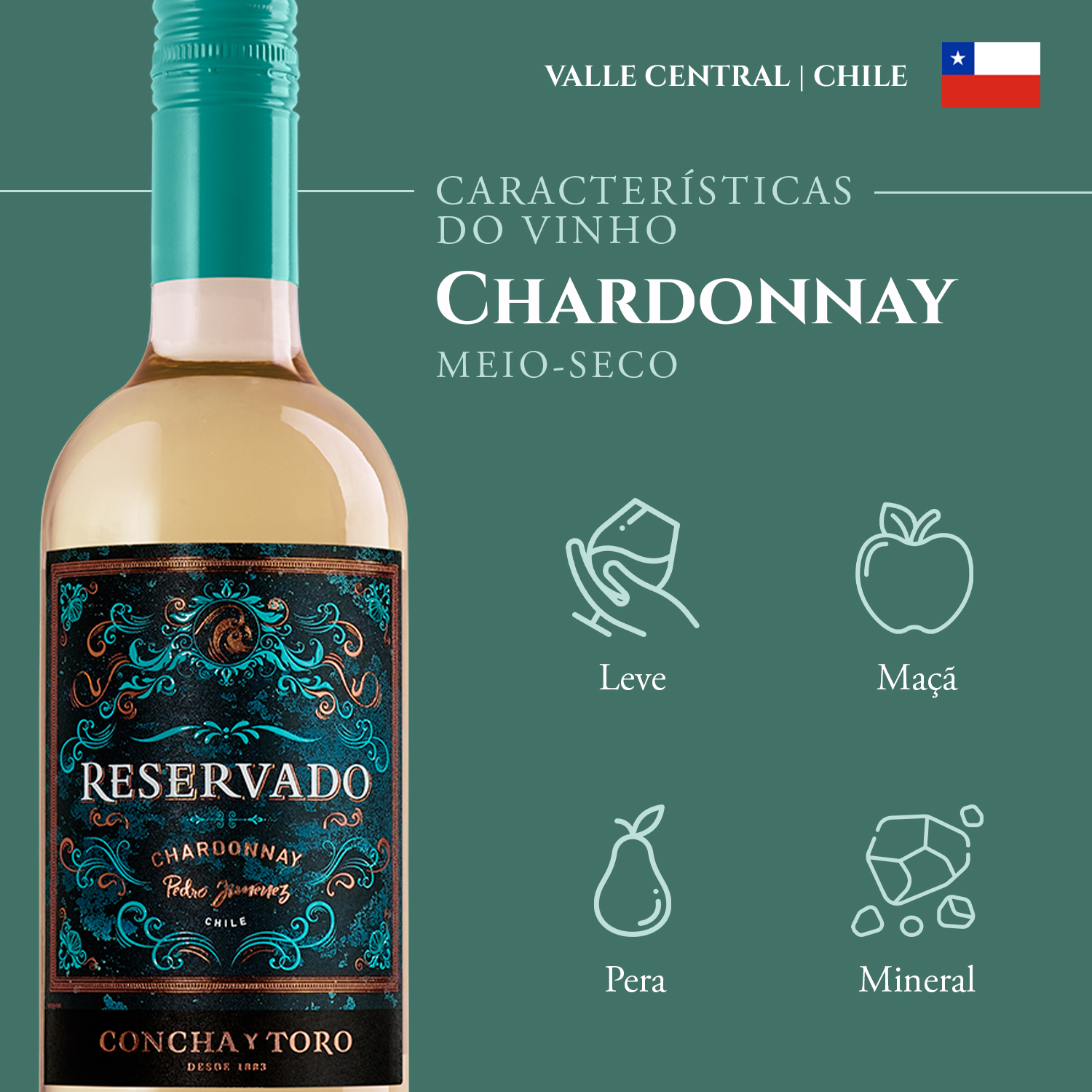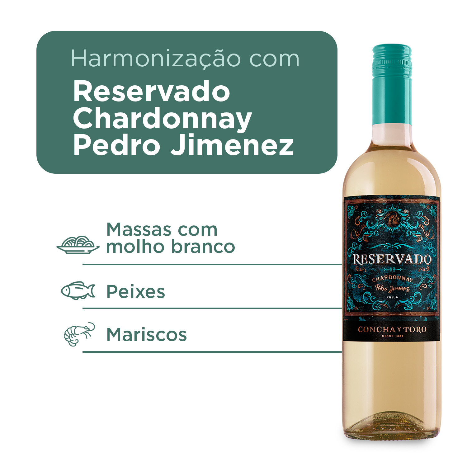 KIT Reservado Pedro Jiménez Chardonnay: leve, frutado e refrescanteDe coloração amarelo claro com reflexos luminosos, este Chardonnay encanta pela leveza e pureza visual, que antecipam sua refrescância. É uma escolha ideal para quem aprecia vinhos brancos delicados e acessíveis, com perfil leve e expressivo.Aromas frutados de maçã, pera e pêssego se misturam a elegantes notas minerais. No paladar, revela-se suave, equilibrado e com final agradável, sendo uma opção versátil para os mais diversos momentos do dia.A linha Reservado da Concha y Toro é sinônimo de qualidade, oferecendo vinhos surpreendentes e versáteis que agradam os paladares mais exigentes.Harmonização perfeita: frutos do mar, peixes grelhados e massas com molhos delicados realçam a leveza e elegância desse branco chileno.3 UNIDADES