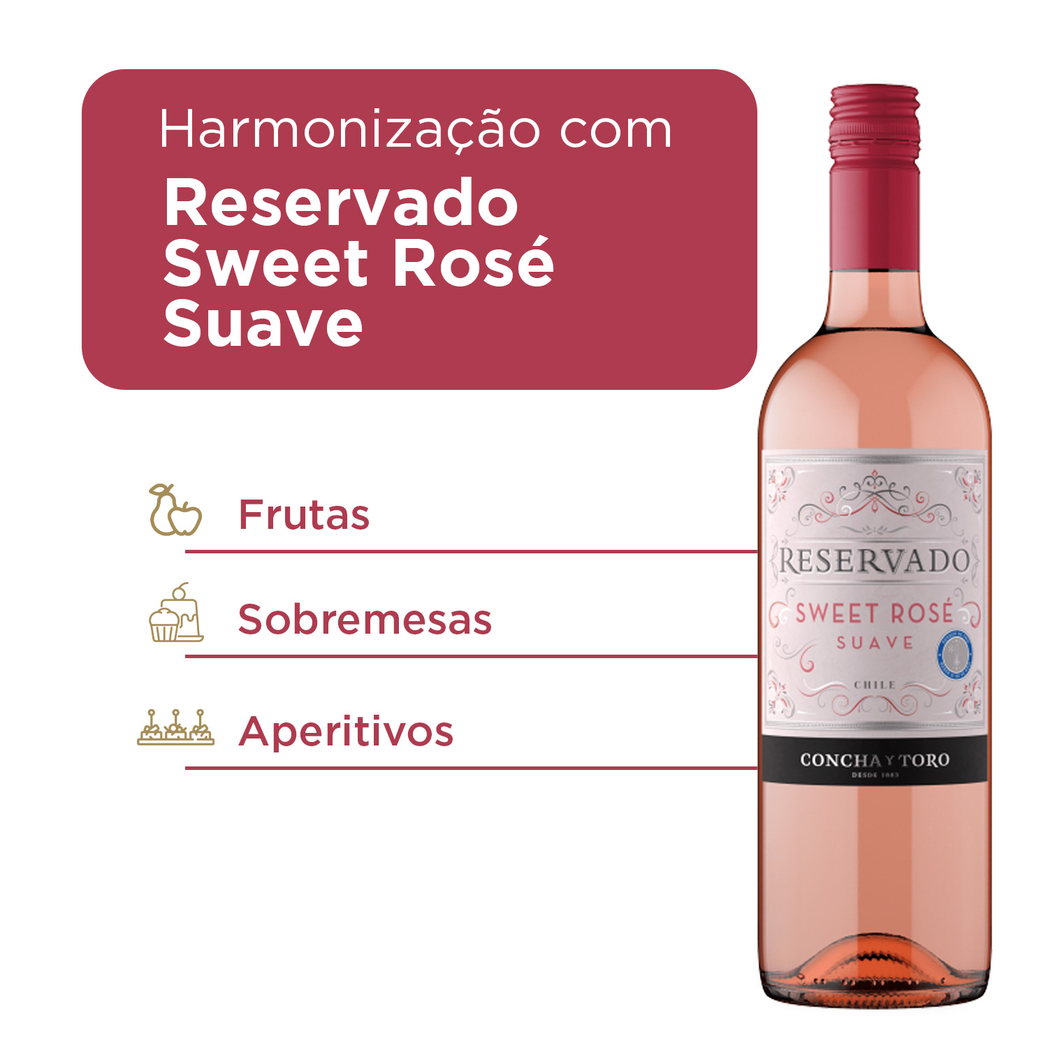 KIT 3 UNIDADES Uma experiência envolvente Concha y ToroRefrescante e vibrante, este Reservado Sweet Rosé conquista com aromas frutados, sabor equilibrado e toque doce.Tom claro e brilhante.Com uma cor rosa delicada e luminosa, perfeito para ocasiões leves e descontraídas.Aromas de frutas vermelhas.Notas marcantes de morango e cereja despertam o olfato com sua intensidade.Sabor doce com acidez leve.No paladar é possível sentir o equilíbrio entre o frescor e dulçor de forma agradável e refrescante.Harmonização versátil.Combina com aperitivos frios, frutas frescas e sobremesas leves como mousses ou tortas.Qualidade Concha y Toro.A linha Reservado Sweet oferece vinhos leves, frutados e com final suavemente adocicado.Características:- Aromas de morango e cereja- Harmoniza com aperitivos frios, frutas frescas e sobremesas levesInformações Técnicas:- Volume: 750 ml- Tipo de vinho: Rosé- Origem: Chile
