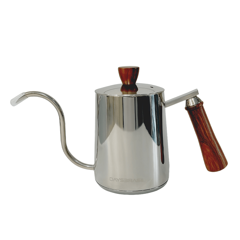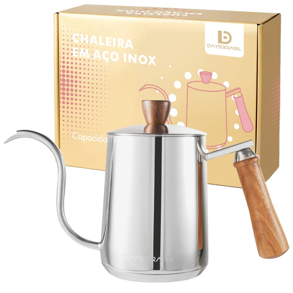 A Chaleira Bico de Ganso em Aço Inox DaysBrasil 600ML é ideal para o controle do fluxo de água durante a extração do seu café. Possui acabamento em aço inoxidável com design clássico e alça de madeira. Pode ser levada ao fogão a gás, elétrico e indução.