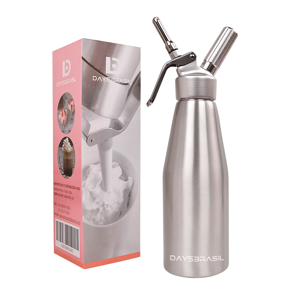 A Garrafa Sifão de Alumínio 1L DaysBrasil, na cor prata e com cabeçote de alumínio, é ideal para o preparo de chantilly, cremes aerados, espumas, mousses e sobremesas. Nossos sifões são fáceis de usar e muito simples de limpar.