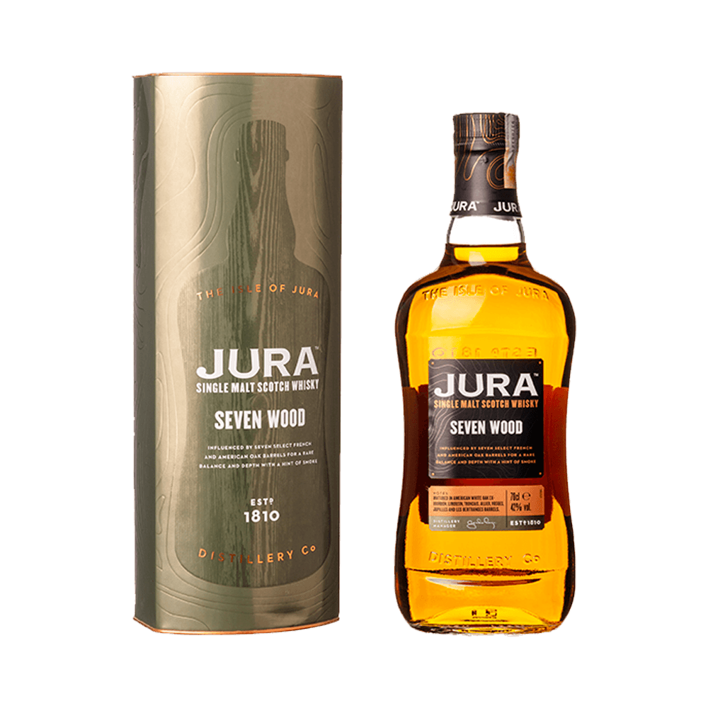 O JURA SEVEN WOOD É, COMO O NOME SUGERE, MATURADO EM SETE BARRICAS DIFERENTES. A PRIMEIRA PARTE DA MATURAÇÃO OCORRE EM BARRIS DE CARVALHO AMERICANO DE EX-BOURBON. DEPOIS, O LÍQUIDO É MATURADO EM BARRIS SEIS DIFERENTES CARVALHOS FRANCESES, DE VOSGES, JUPILLES, LES BERTRANGES, ALLIER, TRONÇAIS, E LIMOUSIN. SUA DESTILARIA ESTÁ LOCALIZADA NA REMOTA ILHA DE JURA, QUE CONTA COM UMA POPULAÇÃO DIMINUTA, DE MENOS DE MIL PESSOAS, MAS, MAIS DE CINCO MIL CERVOS SELVAGENS. NENHUM CERVO FALA FRANCÊS.