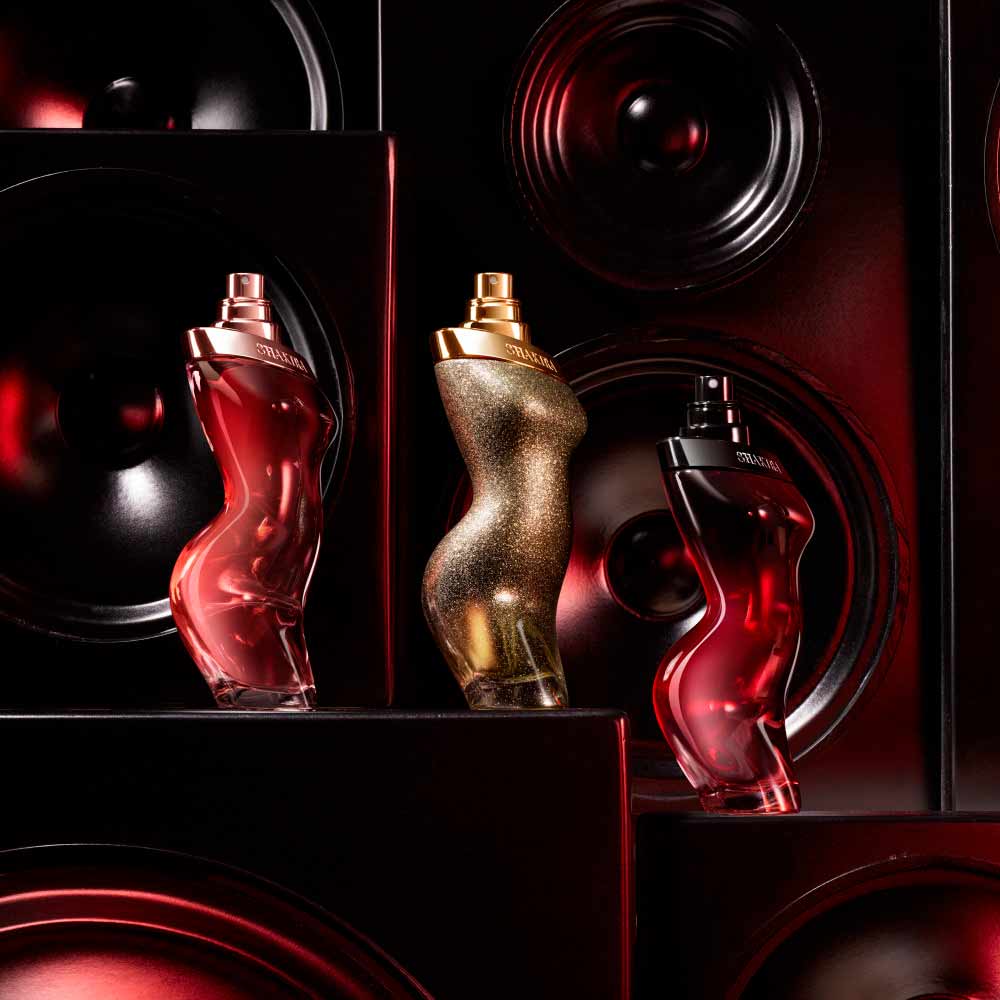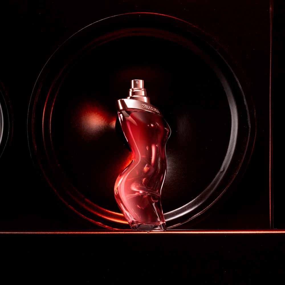 As notas de topo trazem o frescor da bergamota e a sensualidade da pimenta rosa, enquanto o coração é composto por flores brancas como jasmim e flor de laranjeira. As notas de base, com baunilha, madeira de âmbar e chantilly, conferem profundidade e um toque íntimo à fragrância.