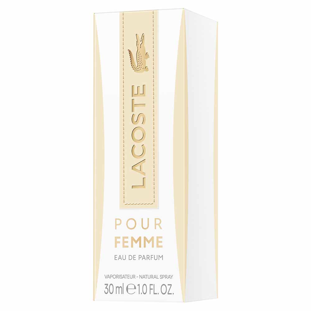 O frasco de Lacoste Pour Femme se destaca por sua silhueta esguia: um totem para as mulheres modernas. A embalagem externa apresenta a forma de ampulheta do frasco em uma harmonia de tons bege, dourado e branco.