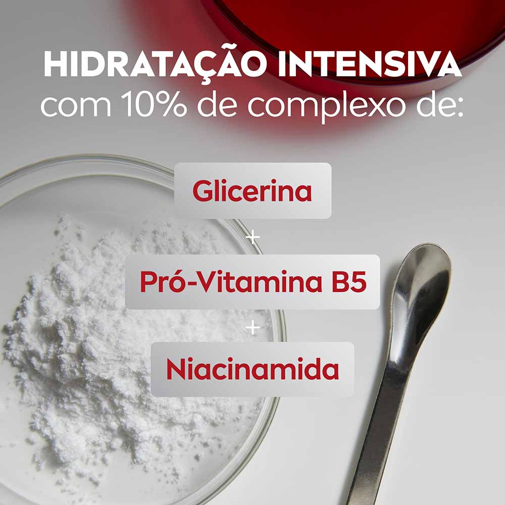 Fórmula enriquecida com 10% de Glicerina, Pró-Vitamina B5 e Niacinamida, esse hidratante proporciona 72h de hidratação, fortalecendo a barreira da pele e hidratando profundamente, enquanto acalma os sintomas da pele ressecada.