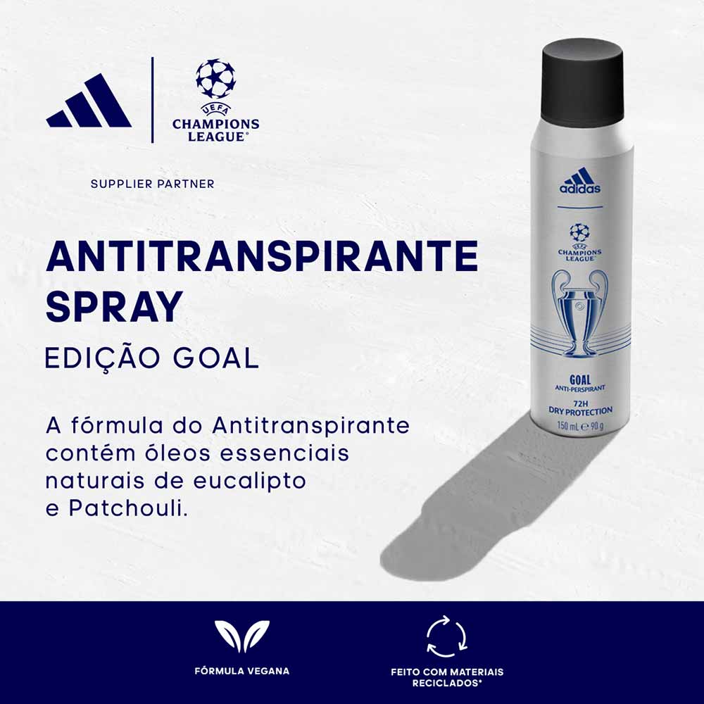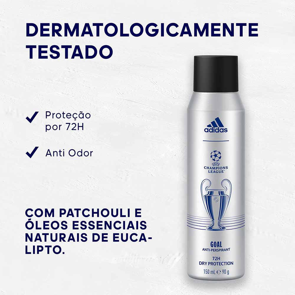 O Perfume Adidas UEFA Champions League Edição Goal é um Eau de Toilette aromático verde, que possui uma fragrância refrescante e poderosa com um toque amadeirado e fresco. Com longa duração, sua fórmula é vegana e feita com materiais reciclados. Conta com uma tecnologia patenteada que promove uma sensação de frescor prolongada durante o dia. Nas notas de topo temos abacaxi, laranja e cardamomo. Já nas notas de coração sálvia, lavanda e gerânio. Por fim, nas notas de fundo temos vetiver, cedro e patchouli. Adidas UEFA Goal, celebra o poder, a singularidade e o amor pelo jogo.