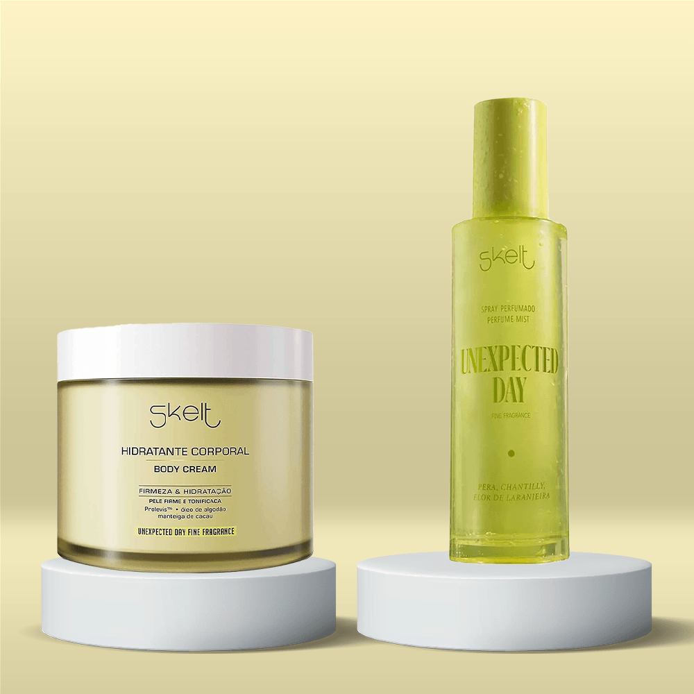 O Skelt Unexpected Day Body Cream contém Prolevis, que promove efeito tensor imediato e firmeza na pele. O óleo de algodão atua com ação antioxidante e anti-inflamatória, enquanto a manteiga de cacau tem efeito emoliente, ajudando na maciez e combate aos radicais livres.