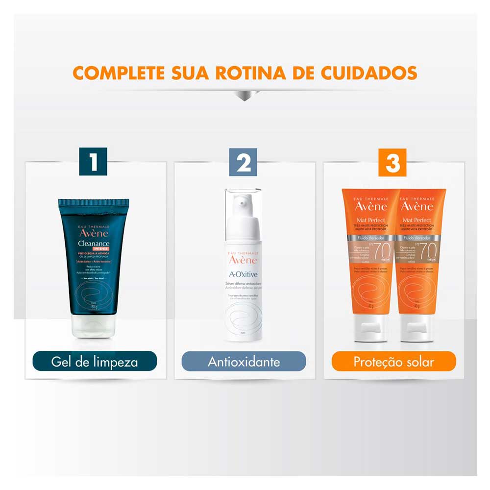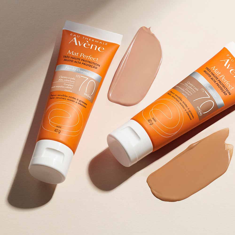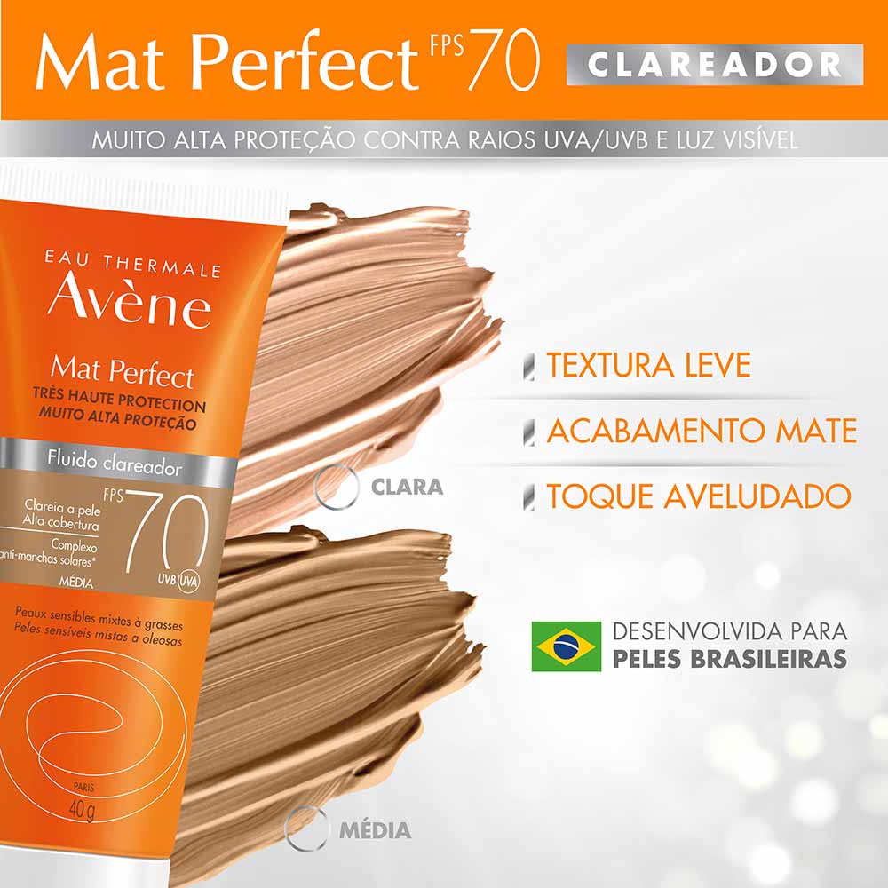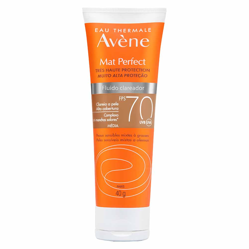 Mat Perfect Fluido clareador FPS 70 é um protetor solar com muito alta proteção contra os raios UVB, UVA e que traz um benefício da ação clareadora que ajuda a clarear, prevenir e uniformizar marcas. Sua fórmula matifica a pele por 12h². Com o seu poderoso Complexo Clareador e antioxidante, HMC + Dextran, Mat Perfect fluido Clareador possui tripla ação anti-marcas. Ele atua clareando as hiperpigmentações existentes, prevenindo novas marcas e uniformizando as diferenças de tonalidade da pele. Assim, garantindo um efeito clareador, além de proteger contra os radicais livres. Com pigmentos corretivos presentes na fórmula, cobre naturalmente as hiperpigmentações, uniformizando o tom da pele. Mat Perfect Fluido Clareador é indicado para as peles sensíveis, mistas a oleosas e com hiperpigmentações. Sua textura leve, com um toque aveludado, matifica a pele por 12 horas. Este produto foi desenvolvido especificamente para peles brasileiras. Principais Benefícios: - Clareia a pele - Previne novas marcas - Uniformiza a tonalidade da pele - Textura leve com toque aveludado - Matifica a pele por 12h - Muito Alta Proteção contra os raios UVB, UVA e luz visível - Enriquecido com vitamina E Principais Ativos: - [HMC + Dextran]: Complexo Clareador com tripla ação anti-marcas: Clareia a pele, previne o reaparecimento de novas marcas e uniformiza a tonalidade da pele. * HMC: Age inibindo a formação de novas marcas na pele ao mesmo tempo que clareia as marcas já existentes, uniformizando a tonalidade da pele. * Sulfato de Dextrano: Ativo com propriedades calmantes e com ação anti-inflamatória que atua reduzindo a irritação e vermelhidão da pele. - Vitamina E: Ativo antioxidante. - Pigmentos corretivos: Uniformiza o tom da pele e faz uma barreira física contra a luz visível. - Monolaurina: Regula a produção de oleosidade. - Água Termal Avène: calmante, anti-irritante e antioxidante. Modo de Uso: Aplique o produto uniformemente sobre a pele antes da exposição solar e sempre que necessário. Reaplicar sempre, após sudorese intensa, nadar ou banhar-se, secar-se com toalha e durante a exposição ao sol. É necessária a reaplicação do produto para manter a sua efetividade. Se a quantidade aplicada não for adequada, o nível de proteção será significativamente reduzido. Ajuda a prevenir as queimaduras solares. Indicação Muito alta proteção solar para as peles sensíveis, mistas a oleosas e com hiperpigmentações.