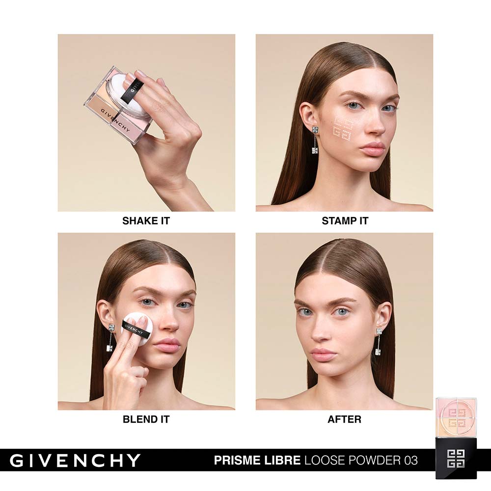 3. Fixe a base com o icônico Pó Solto Prisme Libre de 4 Cores;