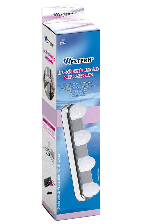 - Dimensões da Peça: 30,5 x 6 x 6,5cm - Dimensões da Embalagem: 7 x 7 x 34,3cm - Quantidade Master: 60 Peças - Dimensões Master: 63 x 46 x 38cm - Material: ABS e LED - Cor: Prata com Branco - Tipo de Embalagem: Caixa litografada - Marca: Western - Origem: China - Contém: 1 unidade - Utiliza 3 Pilhas ""AA "" (não inclusas). - Ótima iluminação com design elegante. - Para garantir a Maquiagem perfeita. - É portátil e fácil de carregar para qualquer lugar! - Não possui fios que atrapalha no visual do seu camarim. - Fácil de instalar. - Possui ventosas. - Especificações: - 3 pilhas “AA” (não inclusas). - Possui 4 Leds. - Potência 3W cada Led. - Recomendações: - Limpe com um pano úmido. - Cuidados: - Evite quedas e batidas. - Não armazene em locais úmidos, sob a