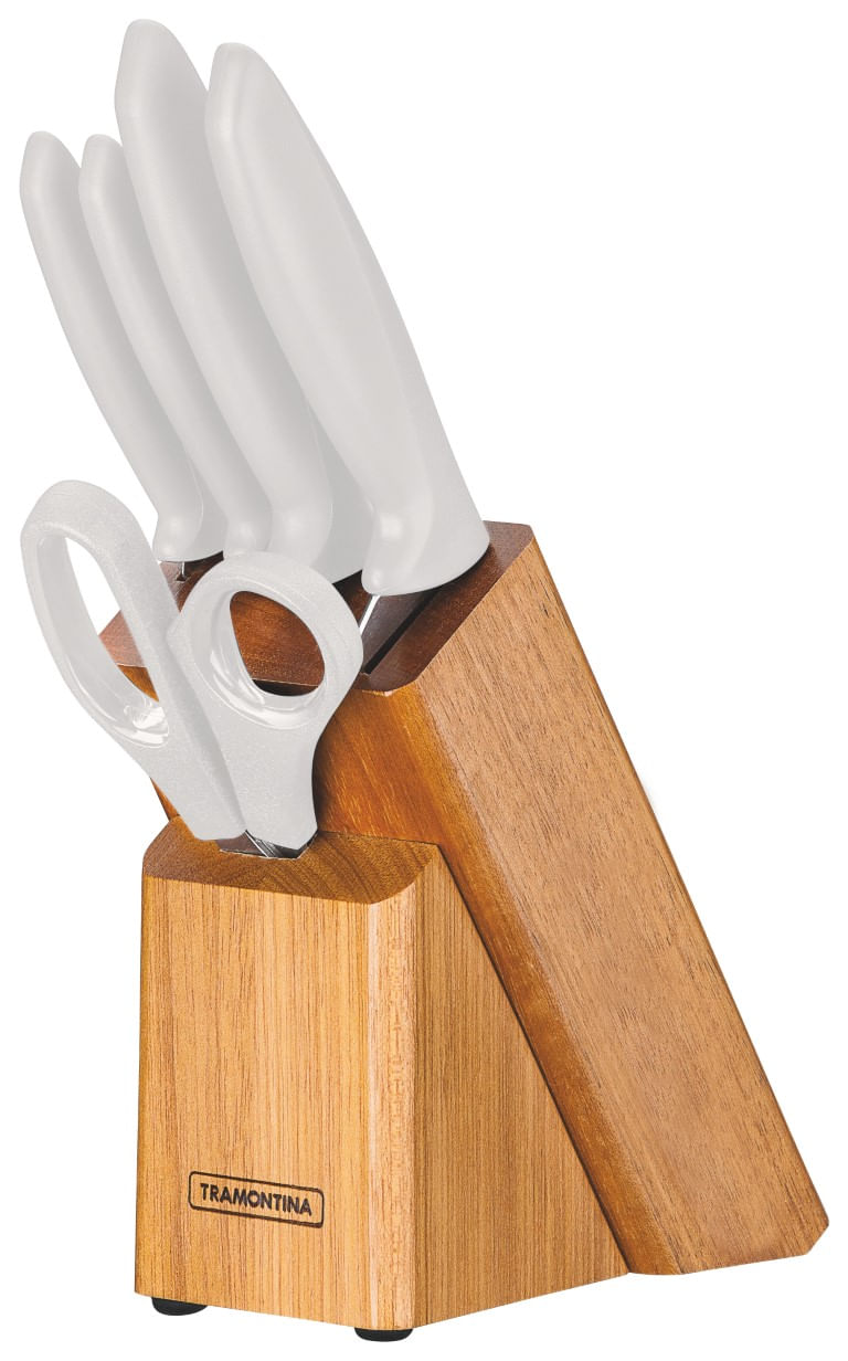 Kit com Facas Brancas e Tesoura com Suporte de Madeira Tramontina