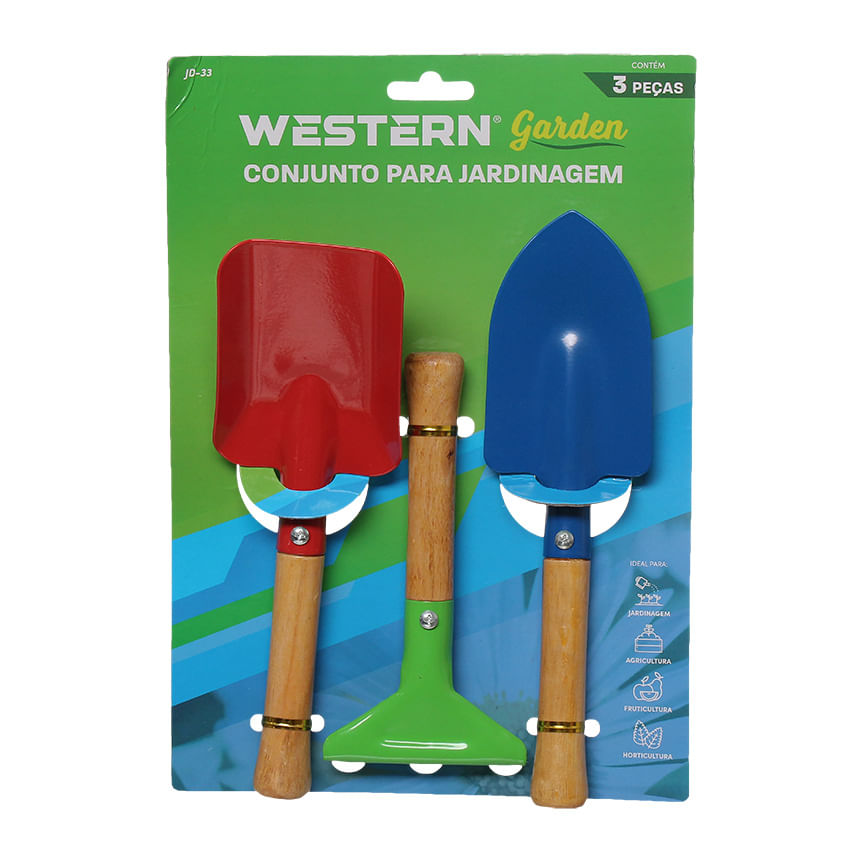 JOGO 3 PEÇAS PARA JARDINAGEM - Contém: • 1 Pá redonda: 2 x 6 x 21cm • 1 Pá quadrada: 2 x 6,5 x 21cm • 1 Ancinho: 2 x 7 x 15cm - Dimensões da Embalagem: 19 x 3,5 x 27cm - Tipo de Embalagem: Solapa - Quantidade Master: 100 - Dimensões Master: 52 x 41 x 39cm - Material: Madeira e Aço carbono - Cor: Azul, Vermelho e Verde - Marca: Western - Origem: China - Recomendações: • Pá quadrada é utilizada para cavar, remover e transportar a terra. • Pá redonda é utilizada para cavar o solo e transplantar mudas. • Ancinho é utilizado para afofar a terra e remover detritos. - Antes do uso: • Verificar se o produto está em perfeitas condições de uso. - Perigos: • Cuidado durante o manuseio do produto para evitar acidentes. - Cuidados: • Mantenha o produto sempre seco e longe de umidade. • Guarde o produto sempre limpo. • Lave com água esponja macia e sabão neutro. • Para secar, utilizar pano macio limpo e seco. - Advertência/Atenção: • Esse produto não é um brinquedo. • Mantenha fora do alcance das crianças. - Sac Fornecedor: • Sac: 0800 607 1322 • Email: posvendas@etilux.com.br • Site: www.etilux.com.br - Garantia: • Em condições normais de uso, este produto tem garantia de 90 dias contra defeitos de material e fabricação, mediante apresentação da nota fiscal de compra. • Má conservação, manuseio inadequado, quedas ou quaisquer outras avarias produzidas pelo uso incorreto, a garantia oferecida perde a validade.
