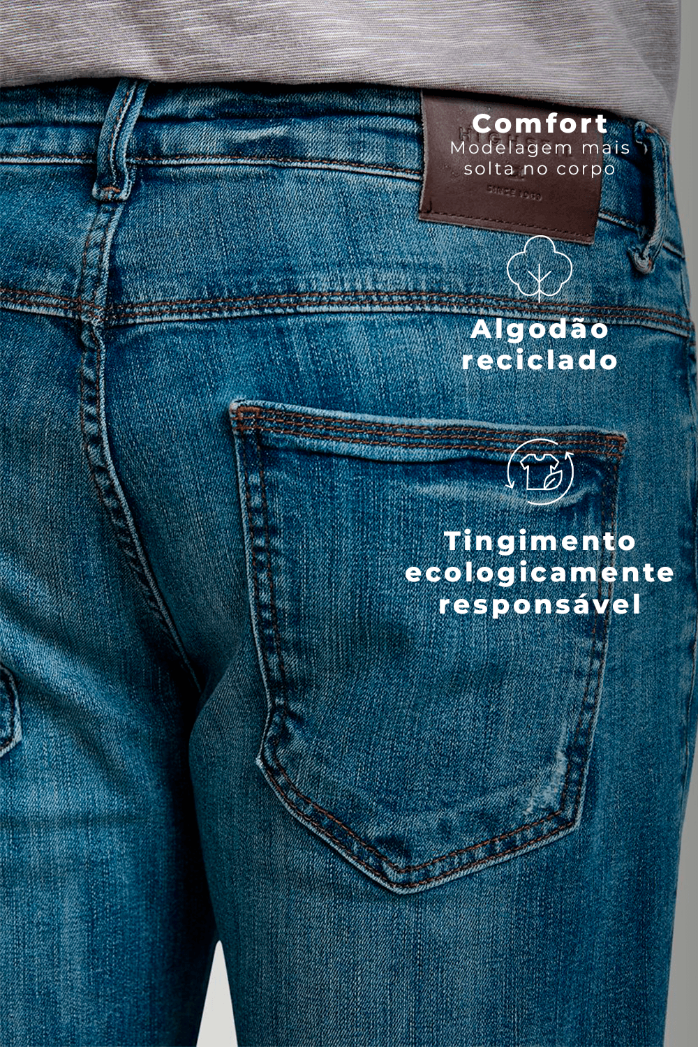 A Calça Jeans Comfort é confeccionada em 98% Algodão e 2% Elastano.